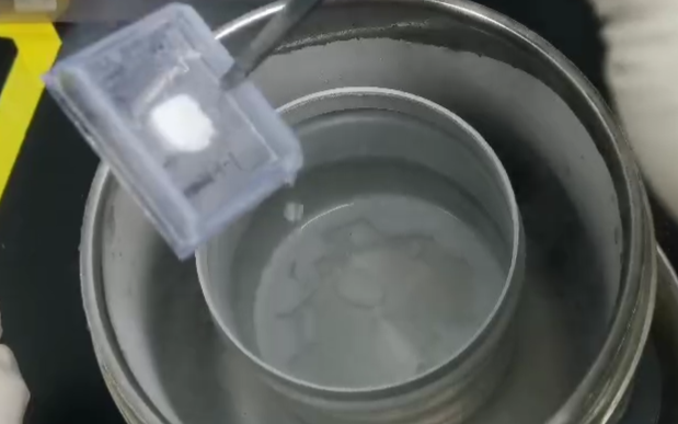在無菌超凈臺中,用異戊烷(足以完全浸沒組織包埋盒)填充三分之二的金屬燒杯,然后放入液氮杜瓦瓶中(液氮與異戊烷保持相同的水平面)以充分接觸,孵育 5-10 分鐘,時間不宜太久,防止異戊烷凝結(jié)。