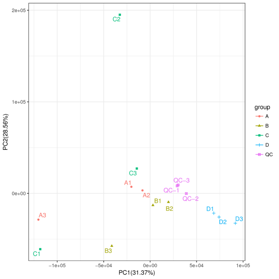 PCA圖現(xiàn)在用形狀和顏色區(qū)分更多的組,一眼就可看到組內(nèi)和組間的代謝模式差別和聚類結(jié)果。同時(shí)顯示QC樣本,通過QC更能直觀的儀器的穩(wěn)定性。