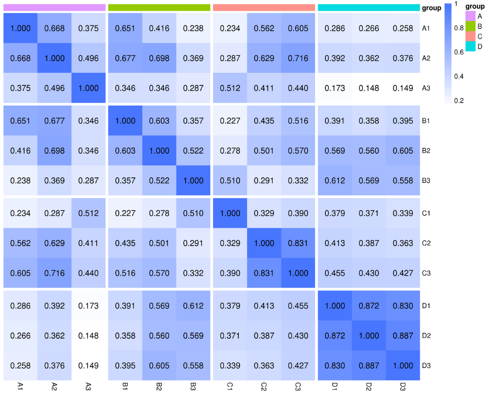樣本相關(guān)性更改配色,并將組間隔開,更加直觀看出組內(nèi)重復(fù)性。