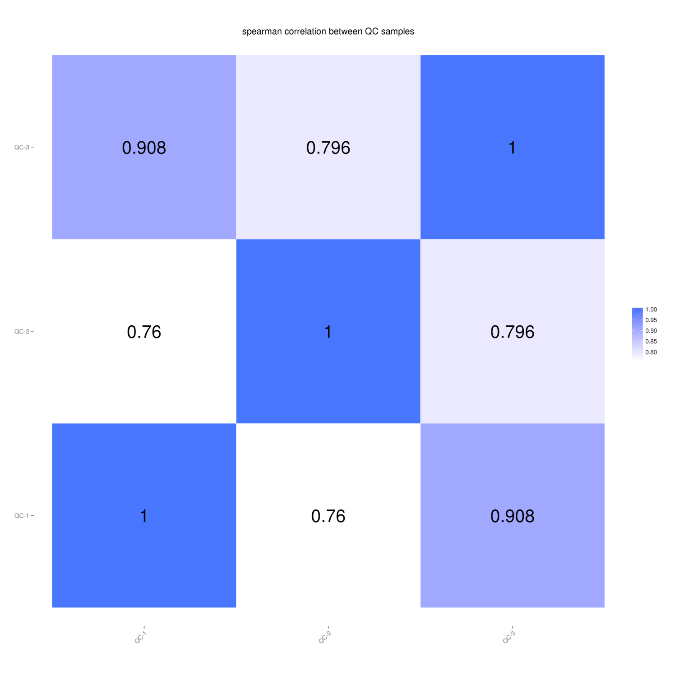 此外,新增QC樣本間的相關(guān)性, 通過計(jì)算QC樣品之間的相關(guān)性分析可以評(píng)估下機(jī)數(shù)據(jù)整體質(zhì)量,一般認(rèn)為QC樣本間相關(guān)性>0.75時(shí),數(shù)據(jù)質(zhì)量較為可靠。