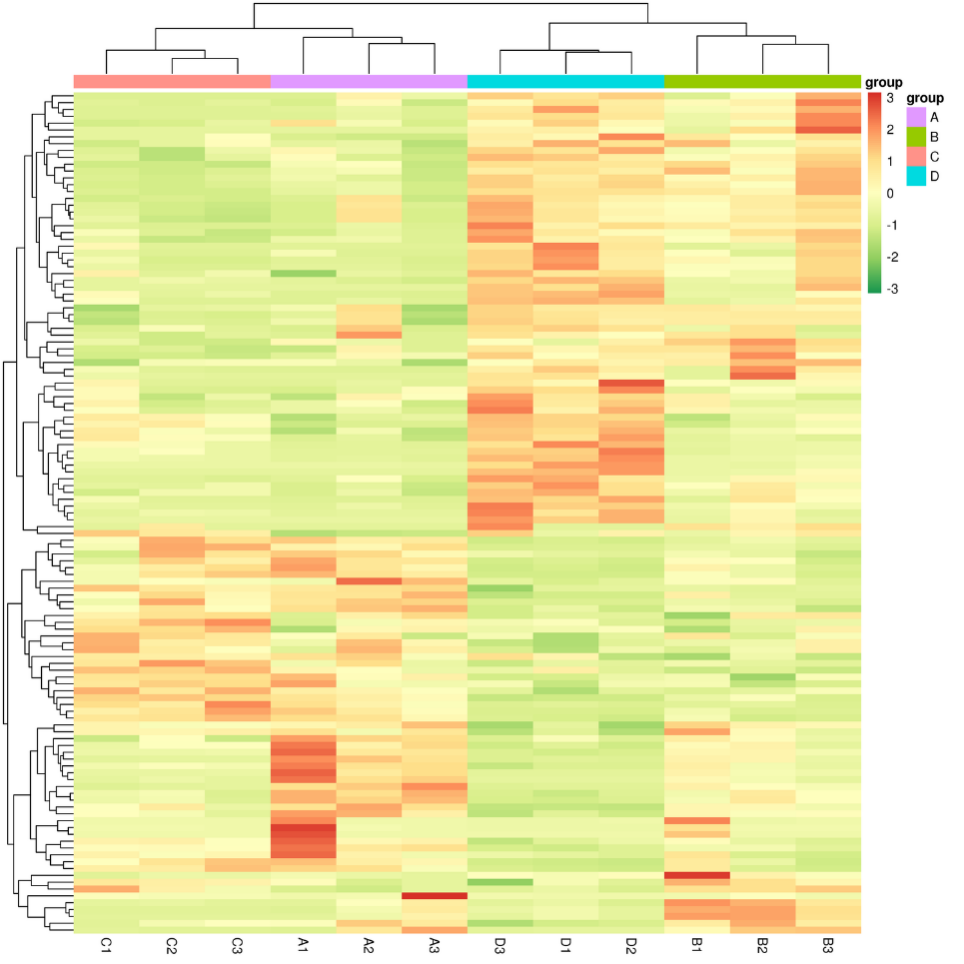 對(duì)篩選的差異代謝物繪制層次聚類熱圖,首先將所有比較組合鑒定出的差異代謝物取并集(Union),繪制此集合在所有樣本的聚類熱圖