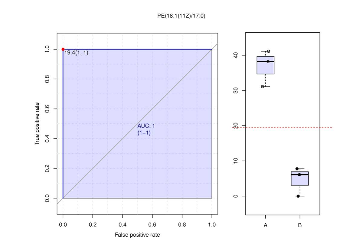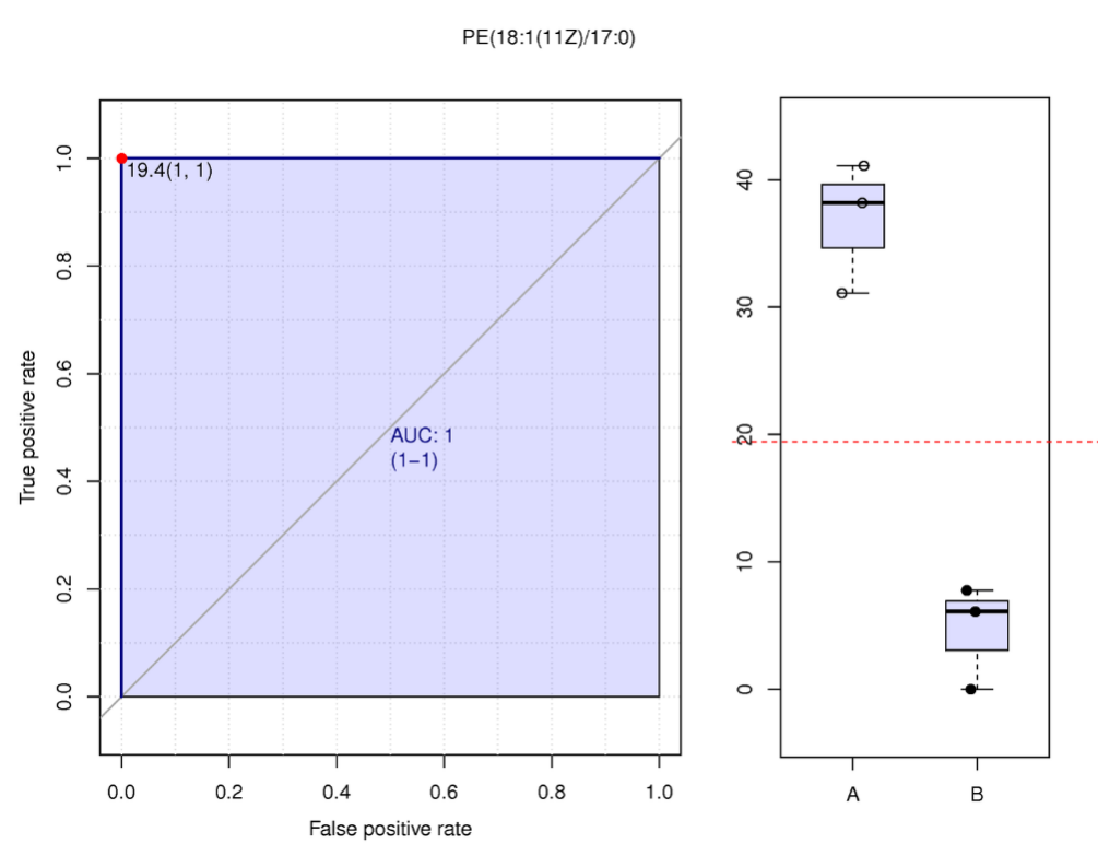 ROC曲線 (receiver operating characteristic curve) 是一種常用來(lái)篩選評(píng)估生物標(biāo)記物的分析方法[9]。AUC (Area under the curve) 是衡量ROC曲線非常有用的度量。AUC始終在0.5(兩個(gè)類在統(tǒng)計(jì)上相同)和1.0(有一個(gè)閾值可以實(shí)現(xiàn)類之間的完美分離)之間,越接近1,物質(zhì)的在對(duì)照組和實(shí)驗(yàn)組的分離就越明顯(即為潛在的生物標(biāo)記物)。一般來(lái)說,組內(nèi)生物學(xué)重復(fù)>15時(shí),ROC曲線才有足夠的點(diǎn)繪制折線,才會(huì)體現(xiàn)出較大意義。對(duì)篩選出的各組差異代謝物單獨(dú)進(jìn)行ROC分析。