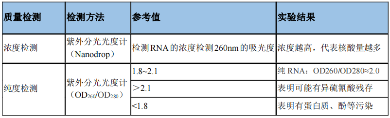 表1:通過(guò)紫外分光光度計(jì)檢測(cè)RNA的濃度和純度