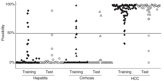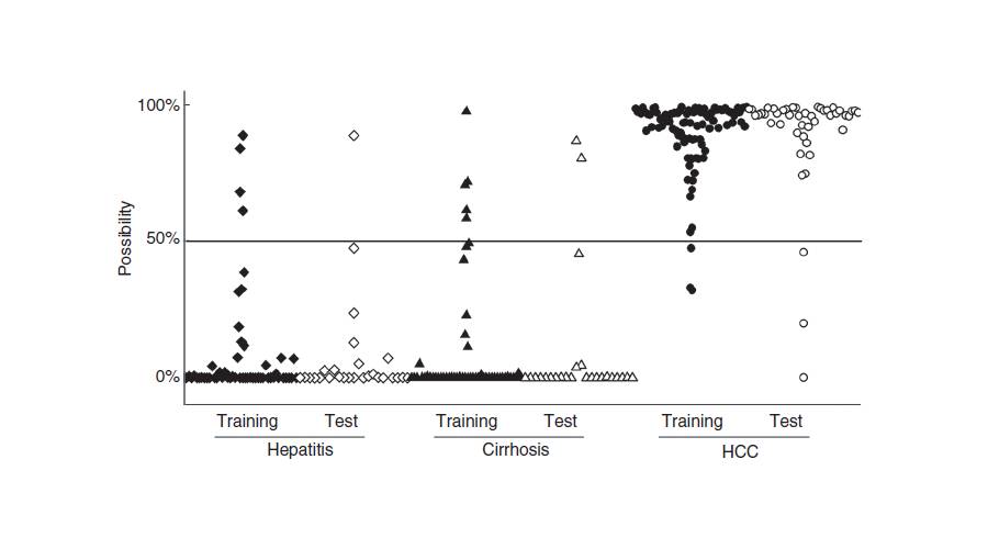 為了評(píng)價(jià)和驗(yàn)證篩選出的差異物是否具有良好的診斷能力,進(jìn)行內(nèi)部驗(yàn)證,即將發(fā)現(xiàn)隊(duì)列的298例樣本中的一部分樣本作為訓(xùn)練集(training set)用來構(gòu)建診斷模型,剩余的樣本作為測(cè)試集(test set)用來測(cè)試篩選出的標(biāo)志物的診斷能力。結(jié)果如圖所示:在訓(xùn)練集中,模型對(duì)慢性肝病和肝癌診斷的準(zhǔn)確性分別達(dá)到91.6%和96.8%,表明模型建立良好。在測(cè)試集中,模型對(duì)慢性肝病和肝癌診斷的準(zhǔn)確性分別達(dá)到94.2%和93.5%,表明篩選到的標(biāo)志物診斷能力良好。