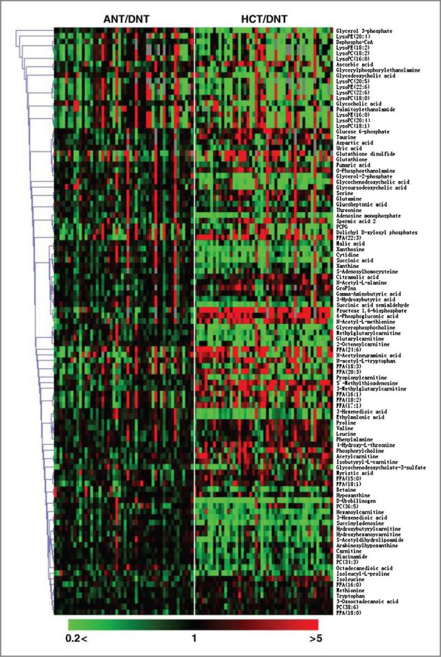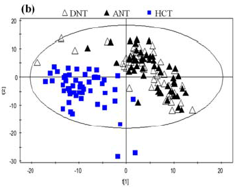 利用非靶向代謝組學(xué)技術(shù)對(duì)50例肝癌患者的癌組織(HCT)與近端癌旁組織(ANT)以及遠(yuǎn)端癌旁組織(DNT)組織樣本中的代謝物進(jìn)行LC-MS檢測(cè)分析,通過多元變量統(tǒng)計(jì)分析發(fā)現(xiàn)癌組織與近端以及遠(yuǎn)端癌旁組織樣本之間區(qū)分明顯(圖1),即癌組織與近端以及遠(yuǎn)端癌旁組織的代謝表型差異顯著。