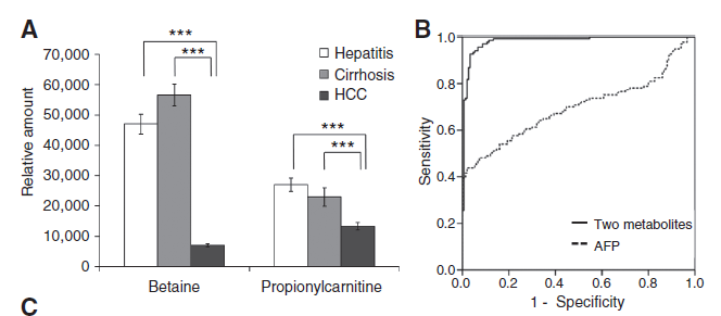 為了更一步分析癌組織與癌旁組織篩選到的差異物是否具有作為臨床診斷的潛力,對(duì)血液樣本進(jìn)行非靶代謝組學(xué)分析,尋找在組織和血液中共有的在組織樣本差異表達(dá)的代謝物。從血液和組織樣本的共同差異代謝物中初篩標(biāo)志物。為了從差異物中找到可以與AFP互補(bǔ)的標(biāo)志物,與常用的肝癌診斷標(biāo)志物甲胎蛋白(AFP)進(jìn)行相關(guān)性分析,在差異物與血漿中的AFP進(jìn)行皮爾森相關(guān)性分析(Pearson correlation analysis),找到了8個(gè)與AFP不相關(guān)的差異物。8個(gè)候選的診斷標(biāo)志物中進(jìn)一步通過篩選到了2個(gè)候選診斷標(biāo)志物(甜菜堿、丙酰肉堿)。如下圖所示,這兩個(gè)標(biāo)志物在肝癌患者中的相對(duì)表達(dá)量顯著下調(diào),組合在一起能夠?qū)Ω伟┖吐愿尾。?98例樣本)能夠進(jìn)行良好的區(qū)分( ROC AUC=0.982),明顯優(yōu)于甲氧蛋白AFP的診斷能力(ROC AUC=0.697)。