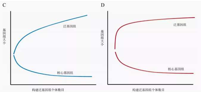 廣義的泛基因組是指獲取該物種全部遺傳信息,構(gòu)建一個非冗余的集合體。由于個體間的差異,在構(gòu)建泛基因組的時候會在參考基因組的基礎(chǔ)上,不斷引入新的特異性序列。因此,統(tǒng)計結(jié)果可發(fā)現(xiàn)整個泛基因組的大小隨著個體數(shù)量的增加而增加,核心基因組(幾乎存在與全部個體基因組中)的大小隨著個體數(shù)量的增加而減?。ㄈ鐖D1)。