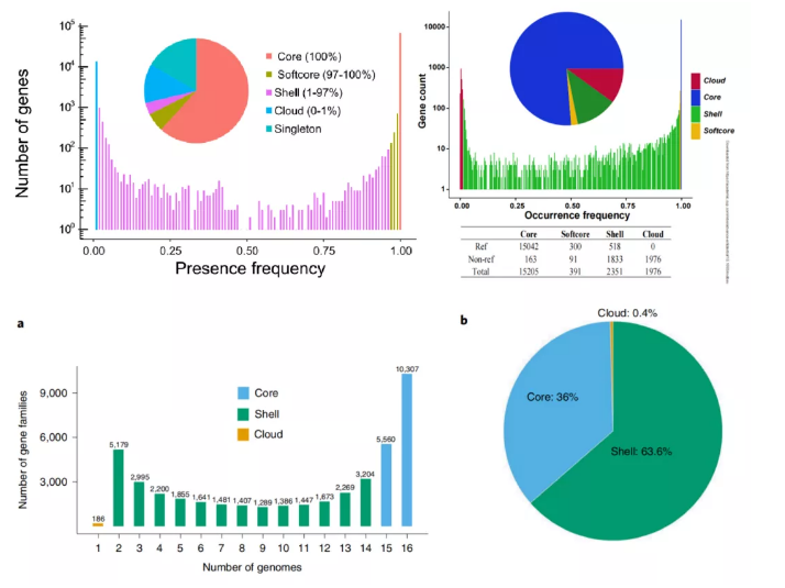 隨著基因組數(shù)量的增加,核心基因的識別將嚴重受到denovo中組裝錯誤的影響。為了糾正這種錯誤,一些科研工作者將泛基因組進一步細分:在所有基因組的為核心基因(core),在幾乎所有品系中發(fā)現(xiàn)的為soft-core,在比soft-core少但不止幾個品系的品系中發(fā)現(xiàn)的shell,以及在只有幾個品系中發(fā)現(xiàn)的為cloud。具體的分類比例與樣品數(shù)量間的關(guān)系并不固定,目的均是為了對基因進行分組,以便進行可靠的比較(圖3)。而這些分組的基因頻率呈現(xiàn)不對稱的首尾高中間低的分布形式,充分展示了不同類別基因型的占比情況。