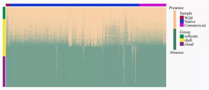 除此之外,根據(jù)core、dispensable等各組分聚類結(jié)果構(gòu)建基因家族的存在與缺失分布熱圖,進一步了解不同材料中的差異情況。同時可結(jié)合不同來源or不同表型等特征充分挖掘其基因型的多態(tài)性。