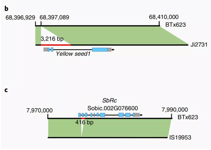 例如高粱泛基因組研究發(fā)現(xiàn),相對于參考基因組,其它高粱個體基因組中有429~1118個基因存在拷貝數(shù)變異(CNV)。功能注釋顯示這些CNV基因豐富了防御反應(yīng)、信號轉(zhuǎn)導(dǎo)和細胞蛋白分解代謝等生物學(xué)過程。并且不同高粱個體基因組上存在大量的存在缺失變異(PAV),有2514個基因受PAV嚴重影響,這些基因富集于與生物和非生物脅迫相關(guān)的生物過程,而抗病基因在這組基因中顯著富集。進一步研究發(fā)現(xiàn)Yellow seed1、SbRc的PAV影響到高粱籽粒顏色變化(圖9)