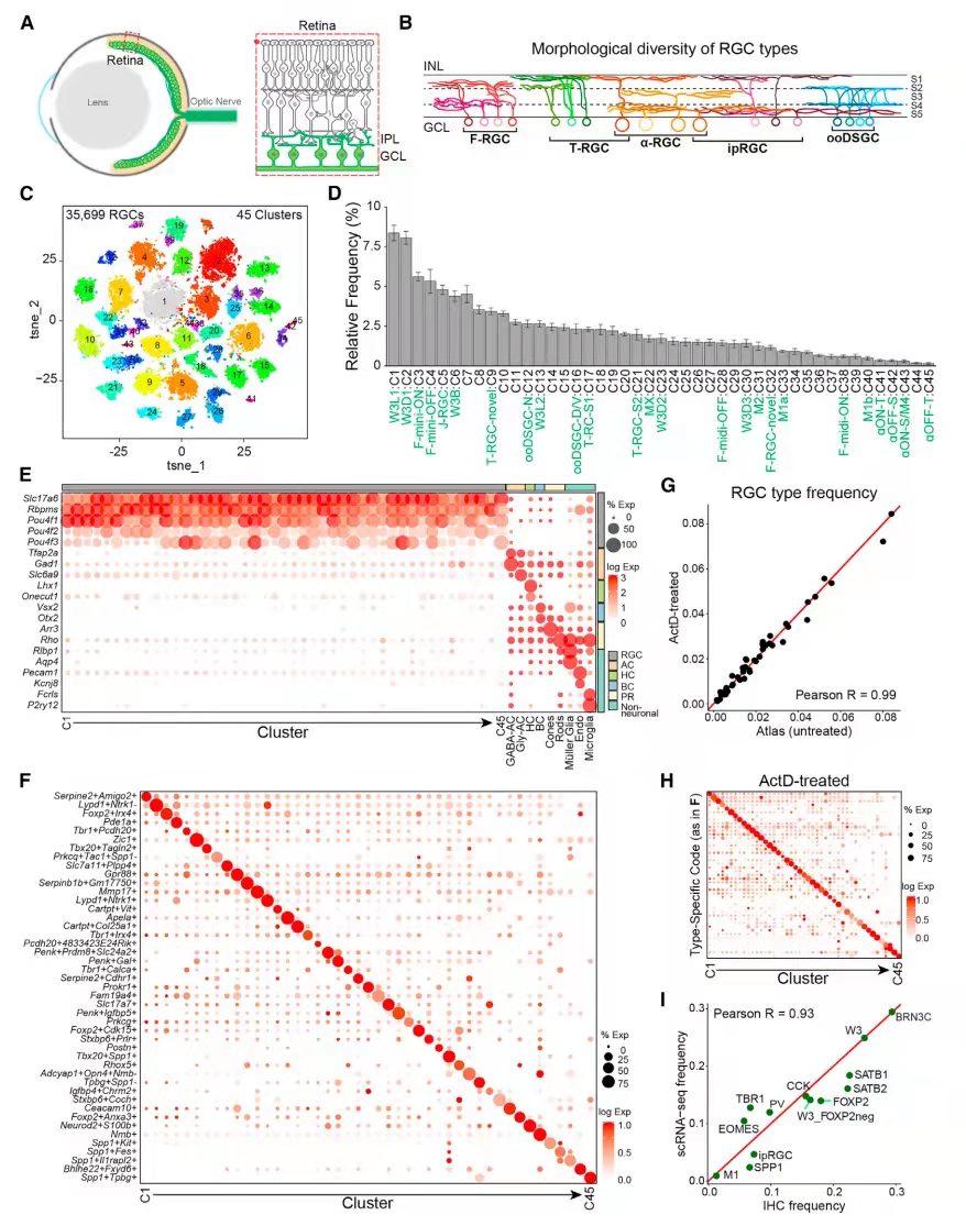 圖1 scRNA-seq揭示成年小鼠45種不同的RGC類型