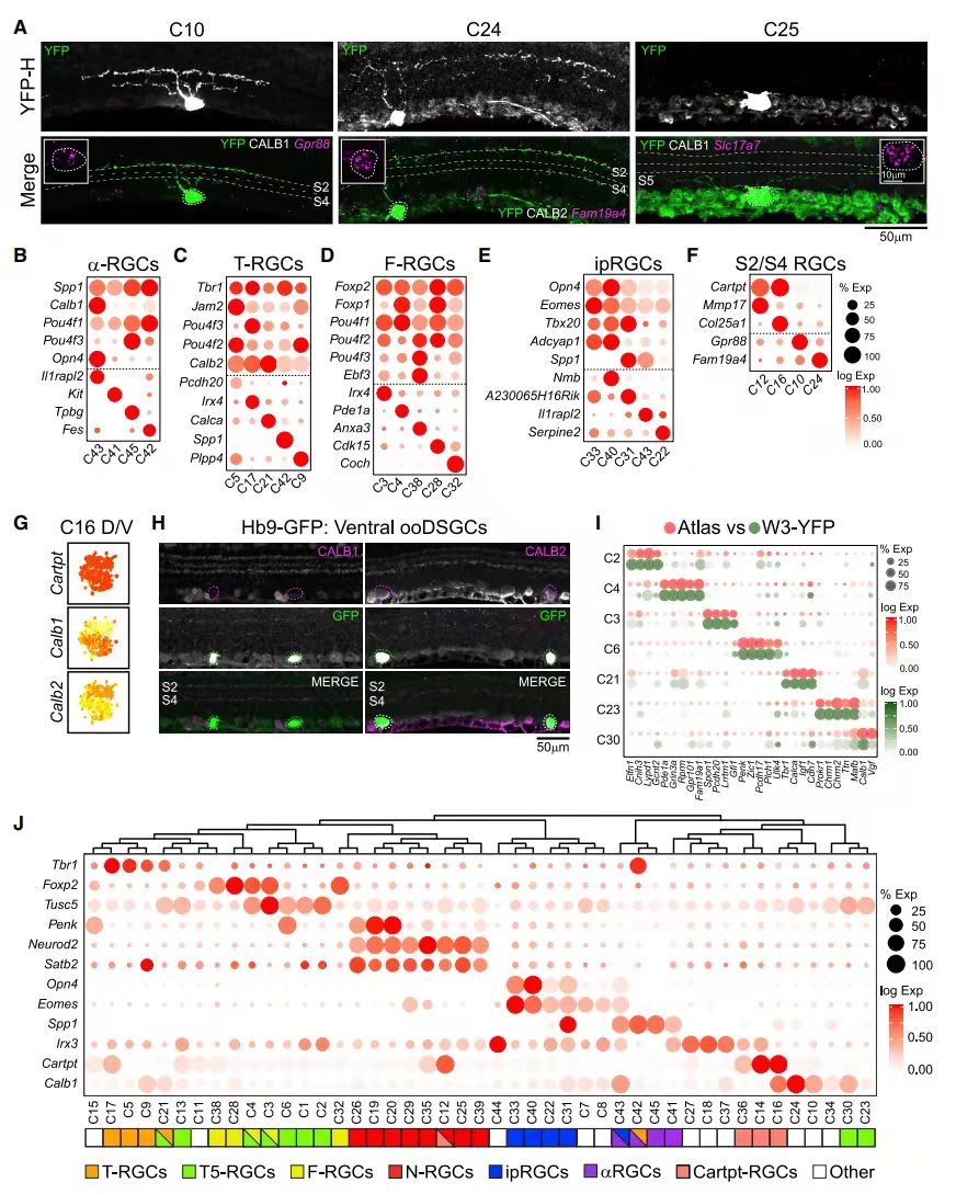 通過scRNA-seq和形態(tài)學對視網(wǎng)膜進行雙重驗證。結(jié)果發(fā)現(xiàn)aRGC為C41-43、45這4個cluster(圖 2B);之前的研究僅確定了4個T-RGC和4個F-RGC類型,但單細胞揭示了每個亞類中的第5種類型(分別為C9和C32;圖 2C和2D);同時ipRGC也發(fā)現(xiàn)了M1(C33和40)、M2(C31)和 M4(C43)類型的標記(圖 2E);ooDSGC中大部分是Cartpt+,通過Mmp17的表達確定了N-ooDSGC;C16表達的Col25a1,是D-和V-ooDSGC的marker。最后CALB1+細胞是D-ooDSGCs ,CALB2高表達細胞是V-ooDSGC(圖 2F-2H)。已知RGC子類與cluster存在部分重合,每種cluster不超過兩個子類。子類與cluster重合表達的基因如圖2J,如:4/5 T-RGCs (Tbr1+)、4/5 F-RGCs (Foxp2+)、5/9 T5-RGCs (Tusc5+)、4/5 ipRGCs(Opn4+)和3/4 aRGC(Spp1+)。另外還鑒定到了新的子類:如8個表達轉(zhuǎn)錄因子Neurod2和Satb2的cluster被化為N-RGC等。其余11/45類型未分配到子類,但它們確實表現(xiàn)出與其他類型的相關(guān)性。