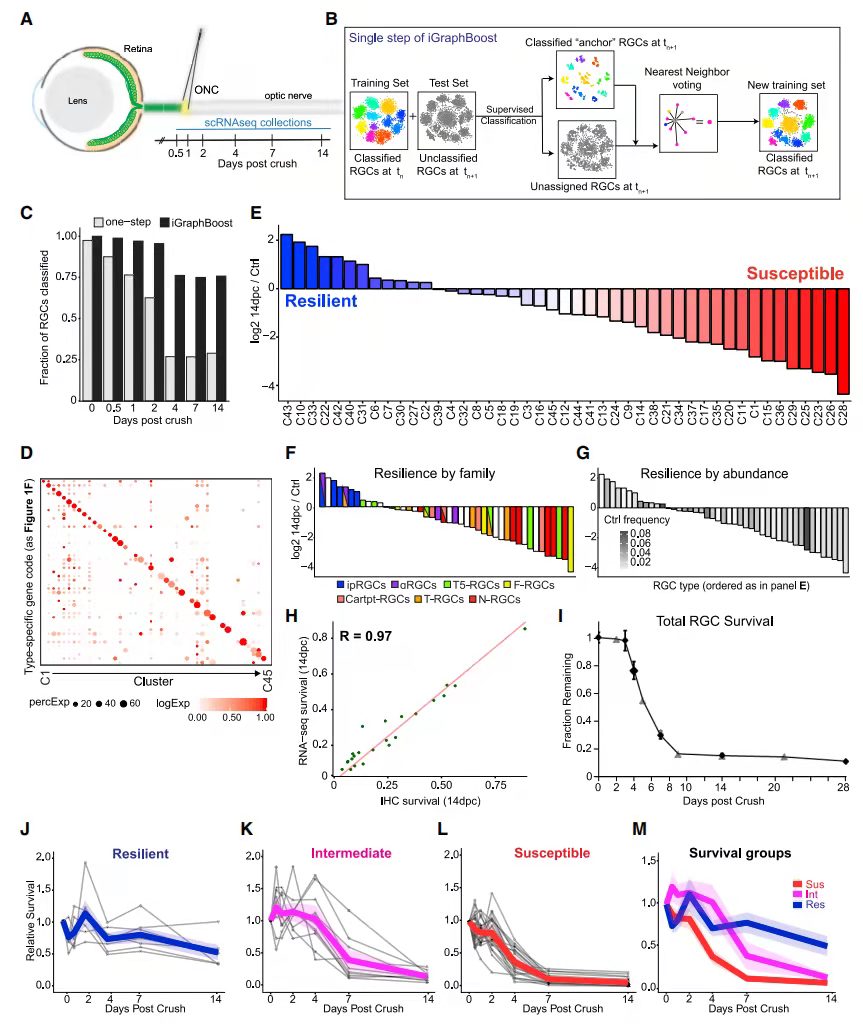 以RGC圖譜為基礎(chǔ),評估了不同細胞類型對ONC的彈性(圖 3A)。在ONC后14天對~8,500個RGC進行分析,此時~80% RGC已經(jīng)死亡(圖 3C),該研究使用iGraphBoost對細胞進行分群(圖 3B),iGraphBoost可以將89%損傷的RGC分配到各個cluster中(圖 3C)。損傷后第14天所有cluster表達的marker基因同1F(圖3D)。與對照相比,將14dpc不同RGC類型的存活率按從高到低排列(圖 3E),不同RGC類型在14dpc時表現(xiàn)出不同的存活率,范圍從1%到98%不等。比較轉(zhuǎn)錄組測序和IHC對細胞活率的結(jié)果,結(jié)果高度一致(Pearson r = 0.97)(圖 3H)。這些數(shù)據(jù)表明不同RGC對傷害的不同反應(yīng)。所有ipRGC(Opn4+)都是有彈性的,所有N-RGC類型都是易受影響的(圖 3F)。之前被定性為彈性子類的aRGC中,C42,43具有很高的彈性,但C41,45相對容易受到影響(圖 3F)。同樣,稀有和豐富的類型都可能具有彈性或脆弱性(圖 3G)。因此,基因表達或RGC子類都不是判斷細胞是否是彈性的完美因子。