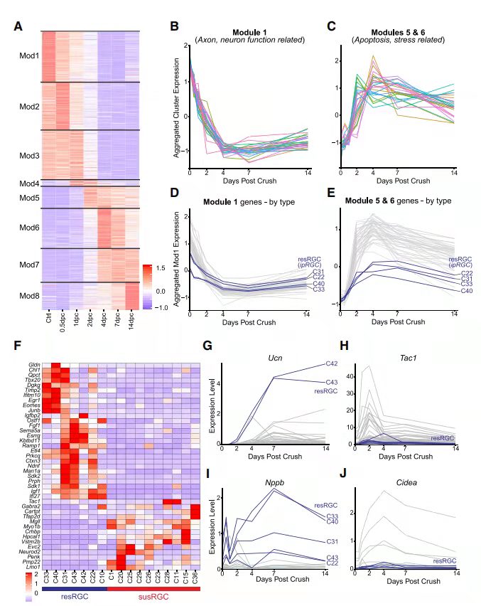 為了研究RGC中激活損傷反應(yīng),對ONC后的RGC進行基因表達譜分析,確定了771個在不同類型之間的DE基因,通過k均值聚類(圖 4A)劃分為8個模塊(Mod1-8),識別具有不同時間動態(tài)的基因集,這些基因集富集在不同的GO功能中,例如在0.5dpc開始下降的模塊1(Mod1)中的基因富集在健康神經(jīng)元相關(guān)的GO功能中,如動作電位、突觸囊泡胞外/內(nèi)吞作用和逆行軸突運輸(圖 4B)。相比之下,在Mod5和Mod6中的基因與細胞凋亡和應(yīng)激途徑相關(guān)(圖 4C)。DE基因幾乎沒有表現(xiàn)出強烈的類型特異性差異,但ipRGC類型除外,Mod5、6和7中C22、C31、C33和C40中的基因的上調(diào)明顯低于其他類型(圖 4D和4E)。