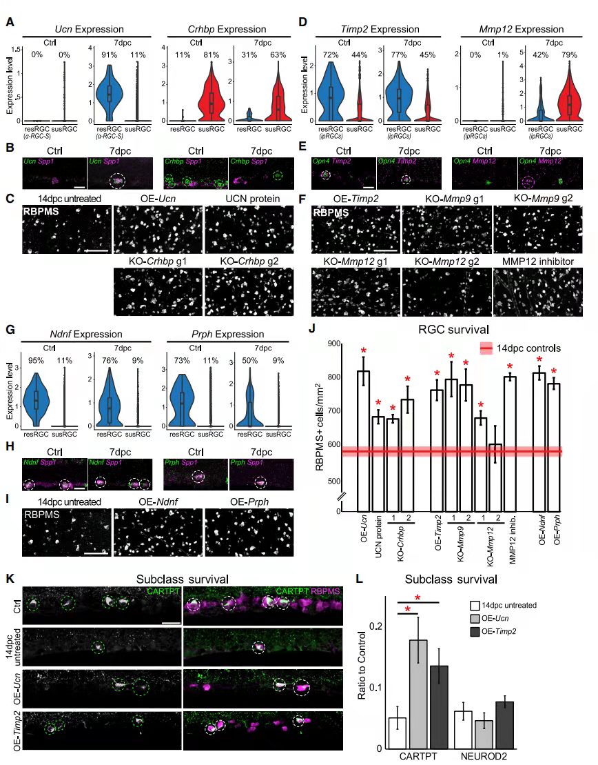 尿皮質(zhì)素(Ucn),它編碼來自促腎上腺皮質(zhì)激素釋放因子家族的肽;促腎上腺皮質(zhì)激素釋放激素結(jié)合蛋白(Crhbp)。ONC后Ucn僅在aRGC中上調(diào),而Crhbp在ONC前后susRGC中表達(圖 5A和5B)。過表達Ucn,注射Ucn重組蛋白,通過CRISPR和兩種不同的sgRNA敲除Crhbp,結(jié)果發(fā)現(xiàn)四種方式都顯著增加RGC的存活率(圖 5C和5J)。隨后又驗證了幾對基因的表達和功能富集情況,結(jié)果與Ucn和Crhbp類似。說明可以通過對基因的干預(yù)來保護部分脆弱的RGC類型。