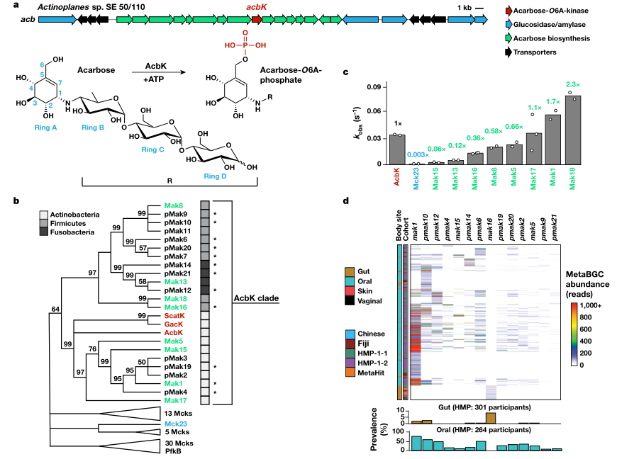 口服非抗生素藥物會無意中影響人體微生物組的組成。例如,阿卡波糖(一種用于治療2型糖尿病的天然衍生的α-葡萄糖苷酶抑制劑)對小鼠模型和人類的腸道微生物群具有深遠的副作用。阿卡波糖是從土壤細菌放線菌中發(fā)現的,并由其工業(yè)化生產。人類微生物組編碼了大量的生化酶和生化途徑,其中大部分仍未確定。研究者使用基于宏基因組學的搜索策略,發(fā)現人類腸道和口腔微生物組的細菌成員編碼的酶選擇性地磷酸化臨床上使用的抗糖尿病藥物阿卡波糖,導致其失活。阿卡波糖是人類和細菌α-葡萄糖苷酶的抑制劑,限制了目標生物代謝復雜碳水化合物的能力。利用生化分析、X射線結晶學和宏基因組學分析發(fā)現,微生物來源的阿卡波糖激酶為其所在的生物體提供了對抗阿卡波糖活性的保護優(yōu)勢,并且廣泛存在于西方和非西方人群的微生物群中。這些結果提供了微生物群對非抗生素藥物的廣泛耐藥性的例子,并表明阿卡波糖耐藥性已經在人類微生物群中傳播,作為一種防御策略對抗?jié)撛诘膬仍葱悦芮邢嚓P分子的產生。