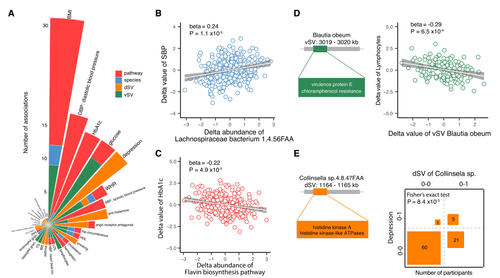 人的腸道中有各種各樣的微生物群落,這些微生物在個體間表現出很大的變異。該研究通過對腸道微生物群、51個人類表型和338個個體的1183個代謝物的血漿水平進行4年的跟蹤調查,描述了微生物的穩(wěn)定性和變異與宿主生理的關系。利用這些個體特異性和時間穩(wěn)定的微生物圖譜,包括細菌SNPs和結構變異,開發(fā)了一種微生物指紋圖譜方法,在對相隔4年的宏基因組樣本進行分類時,準確率高達85%。將該指紋方法應用到獨立的HMP隊列中,對于相隔1年的樣本,準確率為95%。進一步觀察了多種細菌種類的豐度、代謝途徑、結構變異以及菌株替換的時間變化。報告了190個縱向微生物與宿主表型相關,519個與血漿代謝物相關。這些關聯包含心臟代謝特征、維生素B和尿毒癥毒素。最后,中介效應分析表明腸道微生物群可能通過其代謝產物影響心臟代謝健康。