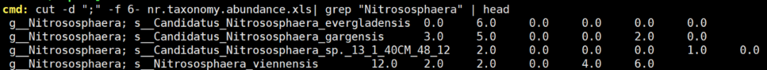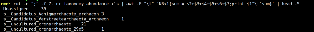 在實(shí)際運(yùn)用過程中,我們通常根據(jù)需要,通過管道符“|”同時(shí)使用好幾種生物信息學(xué)Linux命令,避免花費(fèi)大量時(shí)間找軟件、寫代碼,有些情況下可以代替Excel等辦公軟件。如下就是一些linux命令的高級(jí)使用實(shí)例。如下是一個(gè)宏基因組的NR注釋結(jié)果示例文件: