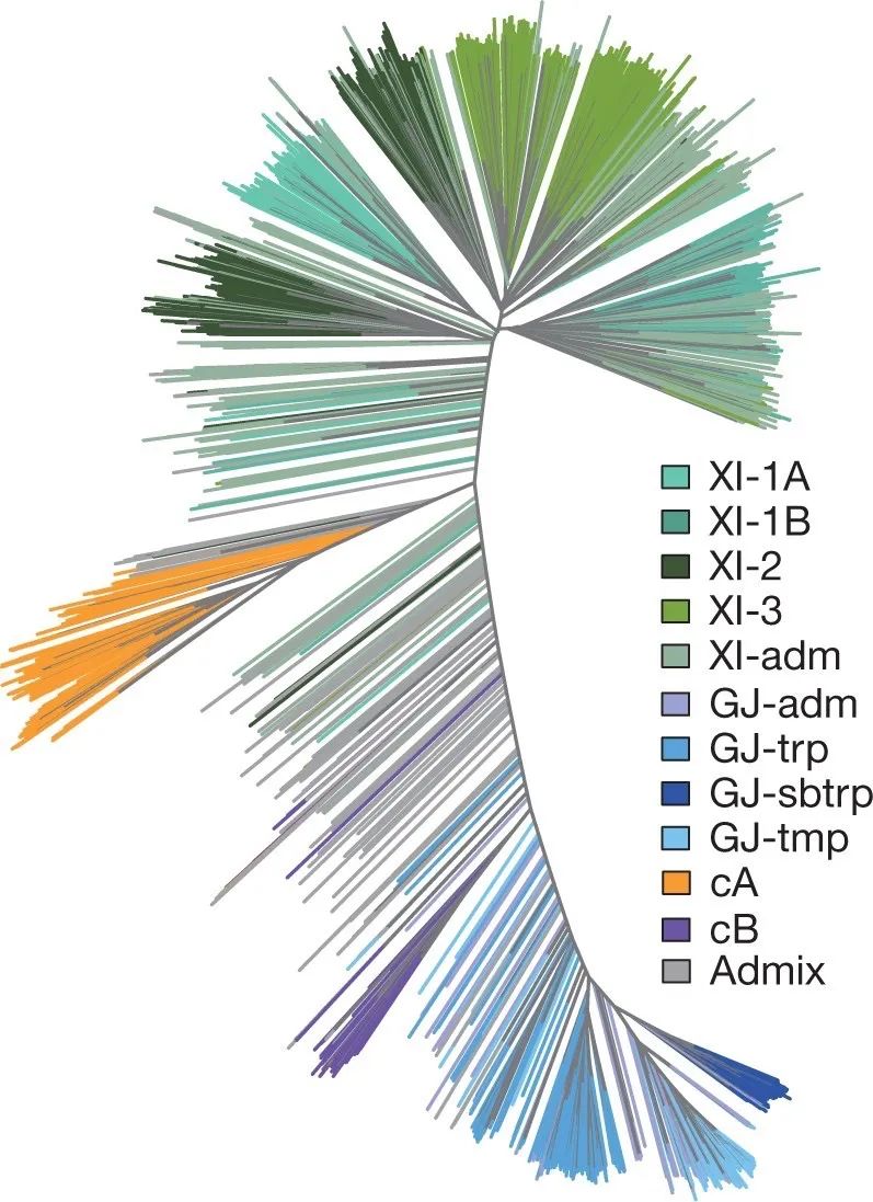 除此之外,陸續(xù)還有不少物種開展了大規(guī)模測序工作,實現(xiàn)對種質(zhì)資源基因型精準鑒定,挖掘優(yōu)異種質(zhì)和優(yōu)異基因,如西南大學團隊對588份油菜進行全基因組重測序,為油菜的起源和改良歷史提供了重要的資源;浙江大學團隊對991份油菜種質(zhì)資源全基因組重測序,揭示了油菜的演化以及不同生態(tài)型油菜開花時間分化在基因組上的足跡;中國農(nóng)業(yè)科學院作物科學研究所團隊對510份苦蕎全基因組重測序,系統(tǒng)構建了苦蕎基因組變異圖譜;南京農(nóng)業(yè)大學團隊對312份梨樹種質(zhì)全基因組重測序,為梨樹的分子育種和基因鑒定提供了遺傳資源;國際竹藤研究中心團隊對417份竹子進行全基因組重測序,揭示了竹子種群結構和性狀遺傳基礎;中國林業(yè)科學研究院林業(yè)研究所利用815份核桃和泡核桃材料構建了核桃基因組變異圖譜,揭示了核桃適應性和重要農(nóng)藝性狀形成的遺傳機制。