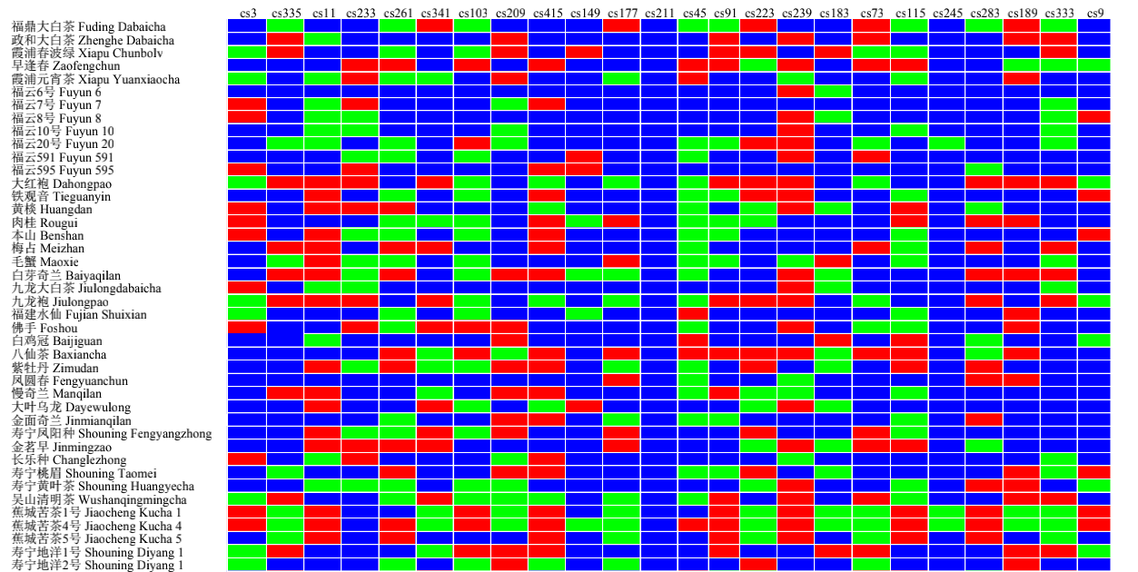 篩選適宜的核心標(biāo)記位點(diǎn),并將其用合適的形式展現(xiàn)出來(lái)至關(guān)重要。利用篩選得到的SNP標(biāo)記進(jìn)行品種材料的鑒定,并構(gòu)建DNA指紋圖譜。例如,玉米DNA指紋圖譜構(gòu)建研究中,利用384個(gè)?SNP?標(biāo)記組合構(gòu)建了?335?個(gè)玉米雜交種的基因型指紋圖譜,?該圖顯示每個(gè)品種的基因型組合均不同,?即?384?個(gè)?SNP?位點(diǎn)能夠有效區(qū)分所測(cè)試的雜交種。
