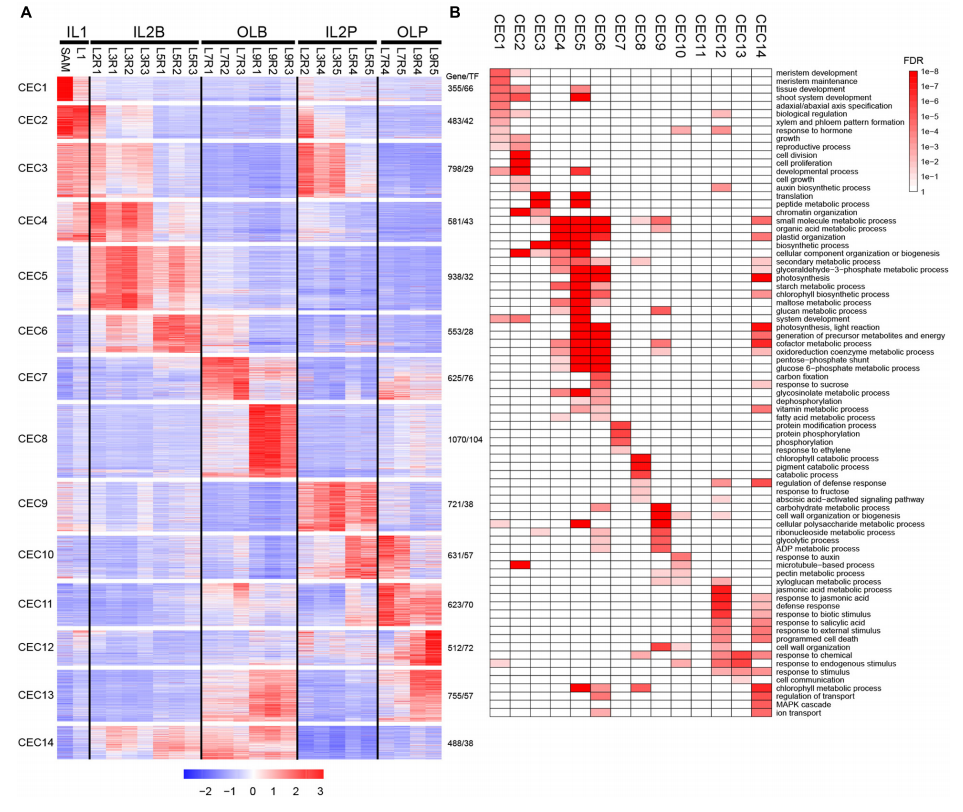 作者在全基因組水平上鑒定了不同葉片中的差異表達(dá)基因(DEG),以探索葉片之間的多樣性和潛在功能。通過(guò)分析,共發(fā)現(xiàn)9,133DEG,k-means聚類(lèi)將差異基因分為14個(gè)共表達(dá)簇(CEC1-CEC14),這些CEC與圖1中的5個(gè)聚類(lèi)簇緊密相關(guān)。IL1中DEGs的高表達(dá)水平以CEC1和2為代表。CEC1在SAM中高度表達(dá),并以與分生組織發(fā)育、組織發(fā)育和近軸/遠(yuǎn)軸極性相關(guān)的基因?yàn)榇?。CEC2在SAM和L1高表達(dá),包含與細(xì)胞分裂、細(xì)胞增殖、細(xì)胞生長(zhǎng)和生長(zhǎng)素生物合成過(guò)程相關(guān)的基因。IL2B中DEG的高表達(dá)水平以CEC4-6為代表。CEC4、5和6均富集于有機(jī)酸代謝過(guò)程、淀粉代謝過(guò)程、質(zhì)體組織和硫苷代謝、光合光反應(yīng)等過(guò)程。IL2P中DEGs的高表達(dá)以CEC9為代表。CEC9富含植物細(xì)胞壁相關(guān)過(guò)程,包括壁組織或生物發(fā)生,以及果膠代謝過(guò)程。OLB中DEGs以CEC7和8為代表。CEC7在L7葉片中高表達(dá),并以與蛋白質(zhì)修飾過(guò)程、蛋白質(zhì)磷酸化和蛋白質(zhì)絲氨酸/蘇氨酸激酶活性相關(guān)的基因?yàn)榇?。這些結(jié)果反映L7具有明顯的信號(hào)轉(zhuǎn)導(dǎo)和基因調(diào)控特征。CEC8在L9葉片中高表達(dá),含有一組與葉綠素分解代謝過(guò)程、細(xì)胞分解代謝過(guò)程、防御反應(yīng)調(diào)節(jié)、果糖反應(yīng)和脫落酸激活信號(hào)通路相關(guān)的基因。OLP中DEG的高表達(dá)水平以CEC11和12為代表。CEC11中的基因在L7-L9的葉柄中高度表達(dá),在任何基因本體(GO)術(shù)語(yǔ)中均未富集。CEC12中的基因在L9的葉柄中高度表達(dá)。這些基因可能主要參與脫落酸激活的信號(hào)通路、茉莉酸(JA)代謝過(guò)程、JA反應(yīng)、防御反應(yīng)、生物刺激反應(yīng)、水楊酸反應(yīng)和外部刺激反應(yīng)。這些結(jié)果表明,L9可能在保護(hù)多葉頭部免受外部損害方面發(fā)揮作用。