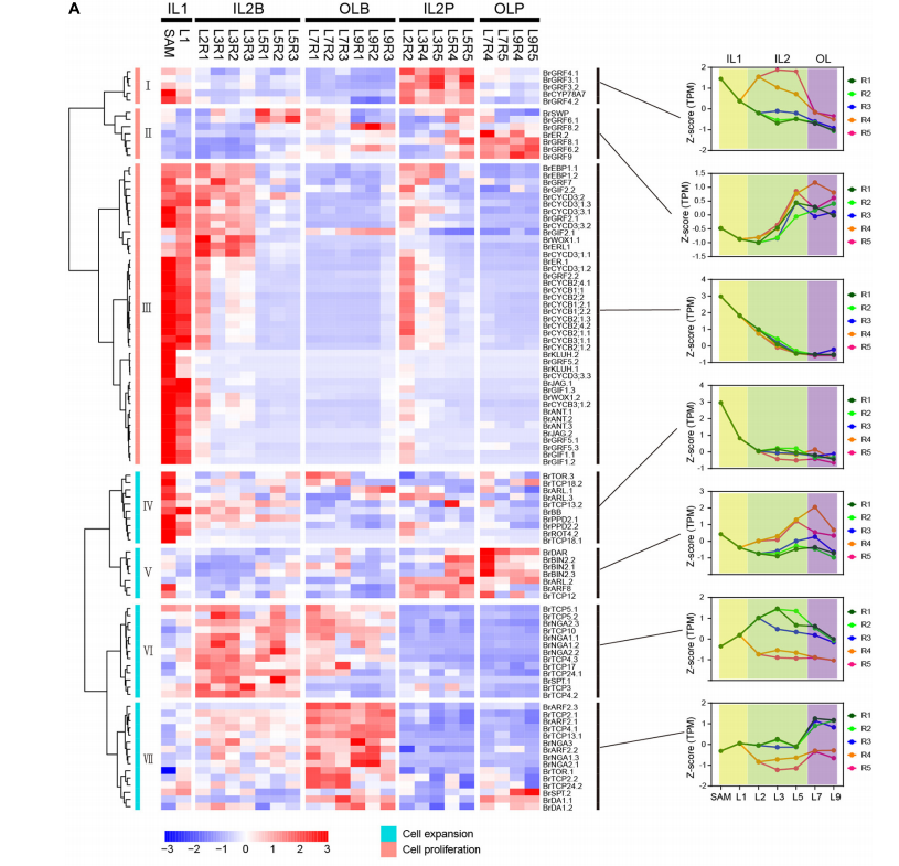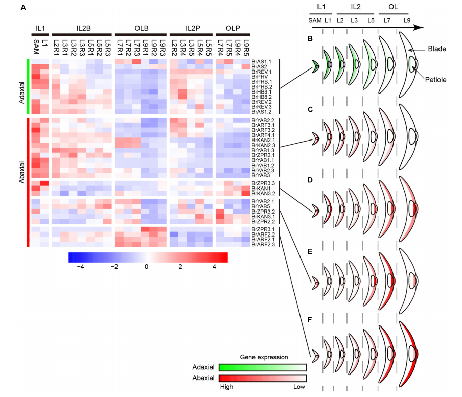 在溫室盆栽大白菜,使用11周大的植物進(jìn)行取樣。隨機(jī)選擇兩個(gè)正常生長(zhǎng)的大白菜。從外葉到內(nèi)葉的所有頭葉(葉長(zhǎng)>2cm)按順序分離收集,而帶有莖尖分生組織(SAM)的幼葉和小內(nèi)葉(葉長(zhǎng)<2cm)不分離,按順序收集。從每個(gè)大白菜頭部共得到30片葉子。從內(nèi)到外,每3片形態(tài)相似、大小相近的葉子為一葉輪,共得到10葉輪葉。