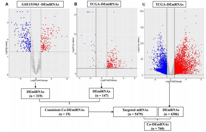 ?通過TCGA數(shù)據(jù)庫和測序數(shù)據(jù)分別得到差異表達的miRNAs和mRNA。然后,通過兩個數(shù)據(jù)集之間的交叉分析,獲得共同差異表達miRNA。再通過靶向的mRNA和TCGA中的差異mRNA的重疊確定共有差異mRNA。利用cytoscape構建了miRNA-mRNA調(diào)控網(wǎng)絡。前5個miRNA在網(wǎng)絡中被確定為樞紐miRNA。通過GO分析和KEGG通路分析,揭示了與樞紐miRNA靶向基因相關的功能和信號通路。利用STRING數(shù)據(jù)庫和CytoHubba對蛋白相互作用(PPI)網(wǎng)絡中的關鍵mRNA進行了鑒定。使用基因表達譜交互分析(GEPIA)進行生存分析。