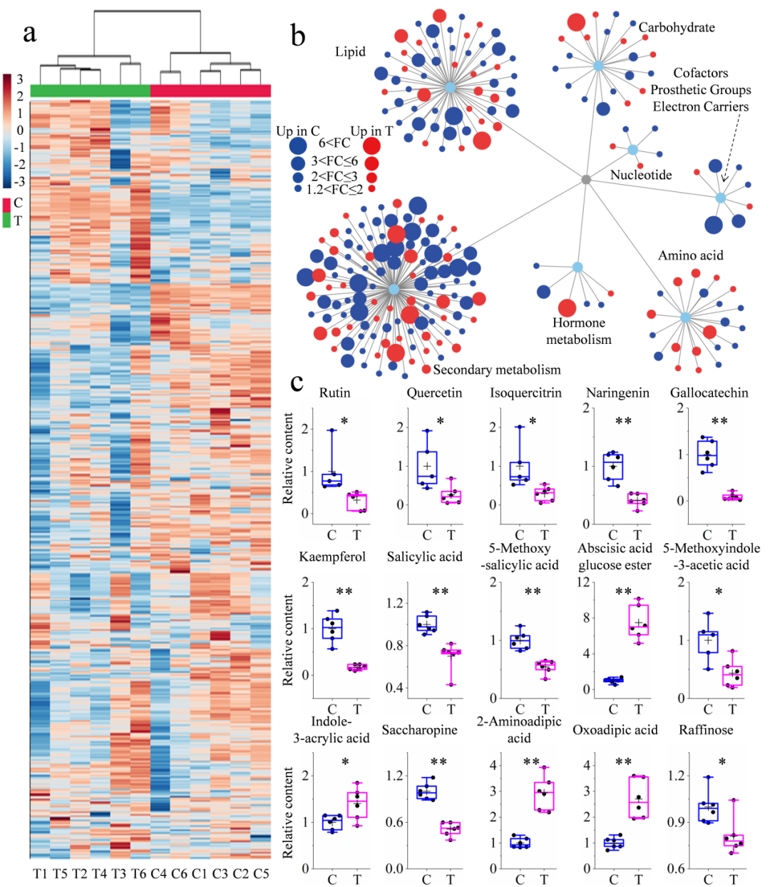 圖2四環(huán)素改變了代謝組,特別是次生代謝和脂質(zhì)代謝。a、代謝物的熱圖譜聚類,顯示代謝物的相對含量。b、差異代謝物根據(jù)其功能/通路的綜合性進行聚類。?圓的大小與折疊變化(FC)值成正比。?紅色表示在四環(huán)素中有更高的FC?(T),而藍色表示在對照中有更高的FC?(C)。c、受四環(huán)素影響的代謝途徑相關(guān)代謝物的箱式圖。?*在P?<?0.05時差異顯著,**在P?<?0.01時差異顯著。