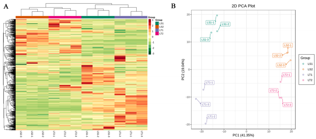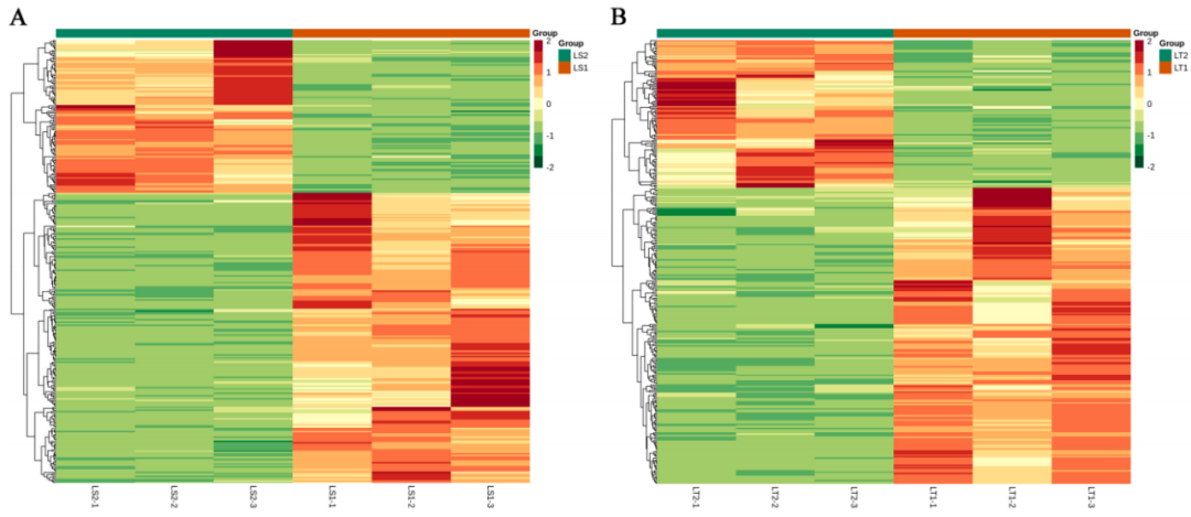 圖2葉芽(LS1和LT1)和成熟葉片(LS2和LT2)代謝組學(xué)分析