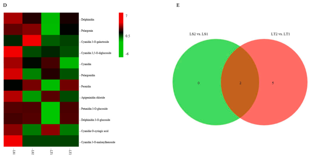為了進(jìn)一步檢測花青素的類型,將花青素與代謝物數(shù)據(jù)庫進(jìn)行比較。其中兩種花青素,即花青素O-丁香酸和芹菜苷氯化物,在葉芽中表現(xiàn)出較高的含量,其他花青素在葉片發(fā)育期間保持在穩(wěn)定水平(圖4D)。從“Tailihong”的葉片中鑒定出11種花青素。其中三種花青素,即芹菜苷氯化物、花青素和花青素O-丁香酸隨著成熟過程而減少。相反,四種花青素,即飛燕草素3-O-葡萄糖苷、天竺葵素、牡丹素和矮牽牛素3-O-葡萄糖苷,隨著葉片發(fā)育而增加(圖4D)。多重比較表明,氰基鄰丁香酸和芹菜素氯化物在兩個紫葉品種的葉芽著色中起著關(guān)鍵作用(圖4E)