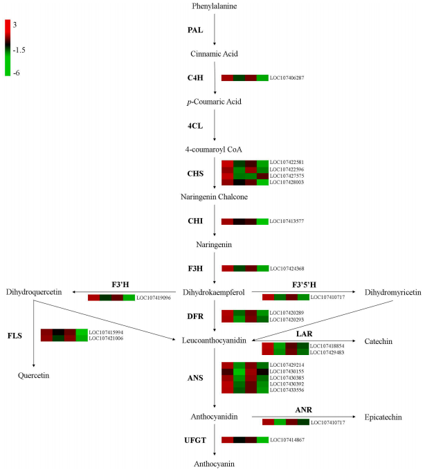 根據(jù)代謝組學(xué)分析結(jié)果,黃酮類化合物是棗葉中的主要代謝產(chǎn)物,并決定了棗葉的顏色。在“Sanbianhong”中,在LS1和LS2之間檢測到20個差異表達(dá)的類黃酮結(jié)構(gòu)基因,并且所有基因都隨著葉片發(fā)育而減少(圖5)。同樣,在成熟過程中,“Tailihong”中19個類黃酮結(jié)構(gòu)基因的表達(dá)大幅下降(圖5)。此外,“Sanbianhong”中差異表達(dá)的類黃酮結(jié)構(gòu)基因大部分與“Tailihong”中的DEGs重疊,包括一個C4H基因、兩個CHS基因、一個CHI基因、一個F3H基因、一個F3′H基因、一個F3′5′H基因、一個FLS基因、兩個DFR基因、兩個LAR基因、四個ANS基因和一個UFGT基因。