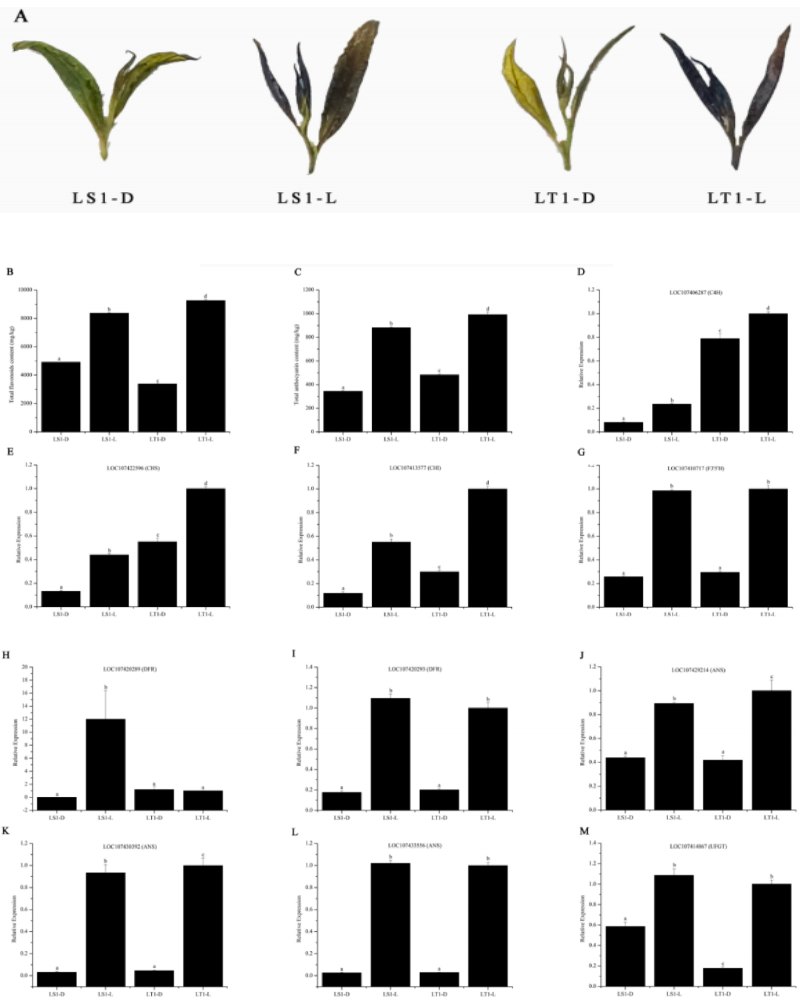 實驗方法:對于光處理的植物,葉芽在萌發(fā)后暴露在自然光下。對于暗處理的植物,葉芽被黑色袋子覆蓋,并在5d后移除。轉(zhuǎn)錄組測序平臺:Illumina?HiSeq?X?Ten;代謝組用UPLC-MS/MS。