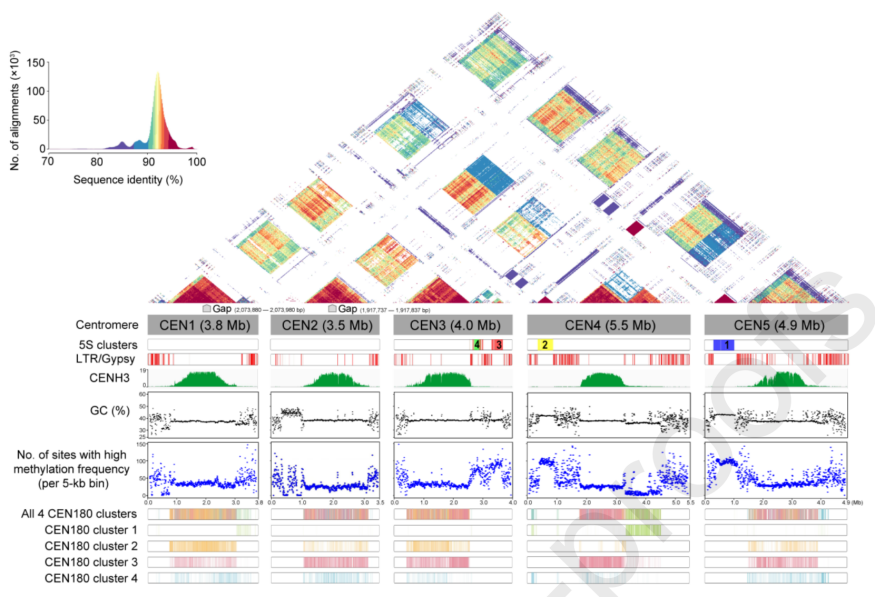 ② ?在雜合度極低的物種中,往往會追求更完美和更準(zhǔn)確的組裝,尤其是解析其上高度復(fù)雜的著絲粒位點(diǎn),植物的著絲粒位于染色體的異染色質(zhì)區(qū)域,該區(qū)域由多種類型的DNA重復(fù)元件組成,主要包括衛(wèi)星DNA序列、單一拷貝DNA、反轉(zhuǎn)錄元件、轉(zhuǎn)座子和端粒類重復(fù)序列等。人類基因組完成圖(Nurk S et al., Science.2022; Altemose N et al., Science.2022; Gershman A et al., Science.2022)、擬南芥T2T基因組(Naish M et al., Science.2021;Wang B et al., GPB.2021)等研究均說明,對著絲粒區(qū)的甲基化等表觀調(diào)控進(jìn)行解析,具有重要的研究意義。例如,擬南芥T2T基因組研究中,作者發(fā)現(xiàn)著絲粒的DNA甲基化高于著絲粒周圍區(qū)域,但在著絲粒內(nèi)部,CENH3信號富集的CEN180高度串聯(lián)重復(fù)區(qū)域呈現(xiàn)低甲基化狀態(tài)(Wang B et al., GPB.2021)。