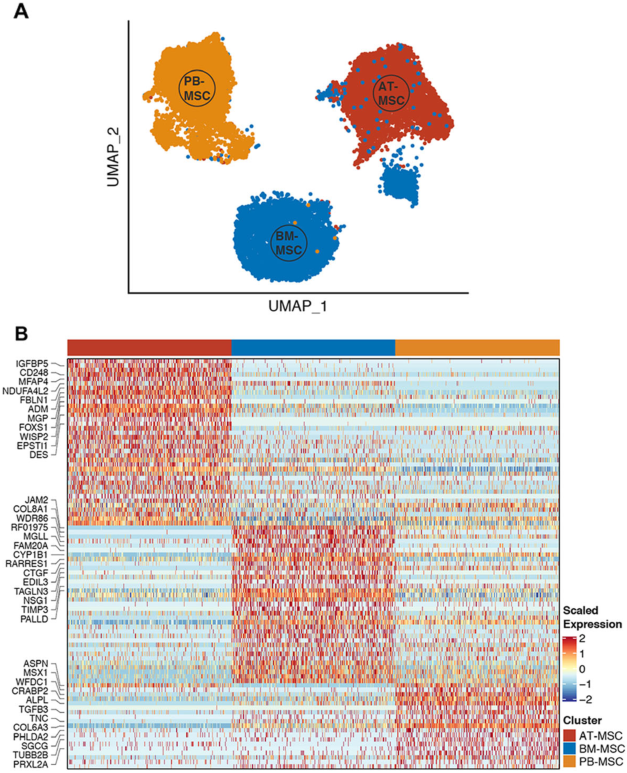 美國康奈爾大學獸醫(yī)學院貝克動物健康研究所Van?de?Walle研究團隊于2020年12月4日在Stem?Cell?Research?&?Therapy上發(fā)表了解析MSC異質(zhì)性的研究進展。文章利用了scRNA-seq等技術(shù)探索三個不同組織來源(AT、BM、PB)的原代馬間充質(zhì)基質(zhì)細胞的源間和源內(nèi)異質(zhì)性,并確定了檢測到的轉(zhuǎn)錄差異與細胞運動和免疫調(diào)節(jié)功能的表型變異相對應(yīng),這將提高MSC?治療潛力,加速其從實驗室到臨床的過渡。
