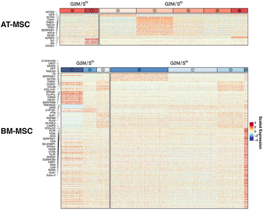 無監(jiān)督聚類分別將AT來源的MSCs、BM來源的MSCs和PBM來源的MSCs聚類為7,7,10個clusters(Fig.?4a)。根據(jù)作者最初的分析中,細胞周期相關(guān)基因的表達對聚類有很大的影響(Kowalczyk?et?al.,?2015)。在本研究中作者也觀察到一些明顯由與增殖一致的基因表達模式定義的簇(Fig.?4b),因此,作者進一步分析了G1?clusters和G2M/S?clusters,以確定不同細胞周期分類的簇間差異基因表達模式。在這種分組策略下,差異基因表達測試顯示來自AT、BM和PB衍生的MSCs中存在明顯的源內(nèi)轉(zhuǎn)錄異質(zhì)性,盡管在AT來源的MSCs中差異較小,差異表達基因?(DEGs)?以熱圖的形式進行展示?(Fig.?5)。為了檢查檢測到的clusters的假定生物學功能,作者對每個組織中的每個cluster進行了GO功能富集分析,其中BM來源的MSCs中排名最靠前的是cluster2的細胞遷移和cluster3中的慢性炎癥反應(yīng),PB來源的MSCs中排名靠前的是cluster4的蛋白組折疊和cluster6中的趨化性調(diào)節(jié),AT來源的MSCs沒有檢測到任何顯著富集的GO?terms,表明檢測到的clusters之間的轉(zhuǎn)錄差異極小。
