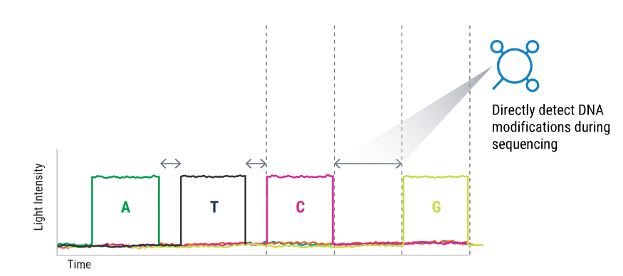PacBio平臺(tái)主要通過(guò)DNA聚合酶與模板鏈結(jié)合,在鏈合成的過(guò)程中,不同熒光標(biāo)記的堿基會(huì)釋放不同的熒光信號(hào),根據(jù)光的波長(zhǎng)與峰值從而判斷堿基類型與順序。聚合酶合成中每個(gè)堿基間都存在時(shí)間間隔,當(dāng)模板堿基有修飾時(shí),兩個(gè)相鄰的脈沖峰之間的距離就會(huì)延長(zhǎng)。當(dāng)IPD比例(兩個(gè)相鄰的脈沖峰之間的距離和參考序列距離的比值)明顯大于1 時(shí),可推斷這個(gè)位置存在修飾。