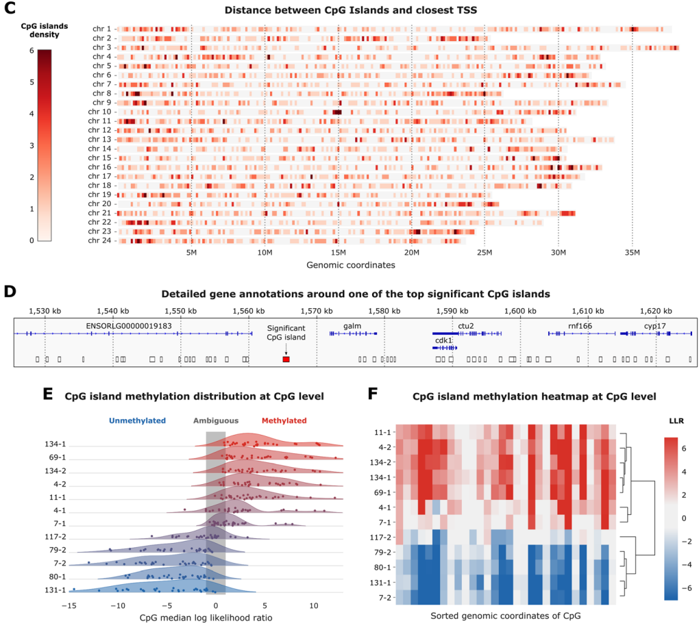 - 圖D中突出顯示的CpG島的對(duì)數(shù)似然比熱圖,按樣本分層聚類。X軸上是按基因組位置排序的單個(gè)CpG