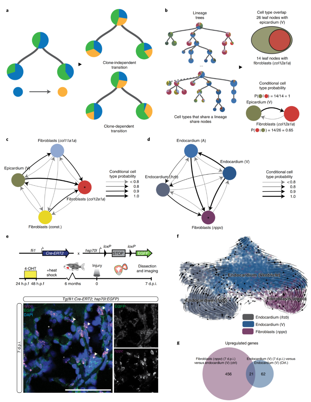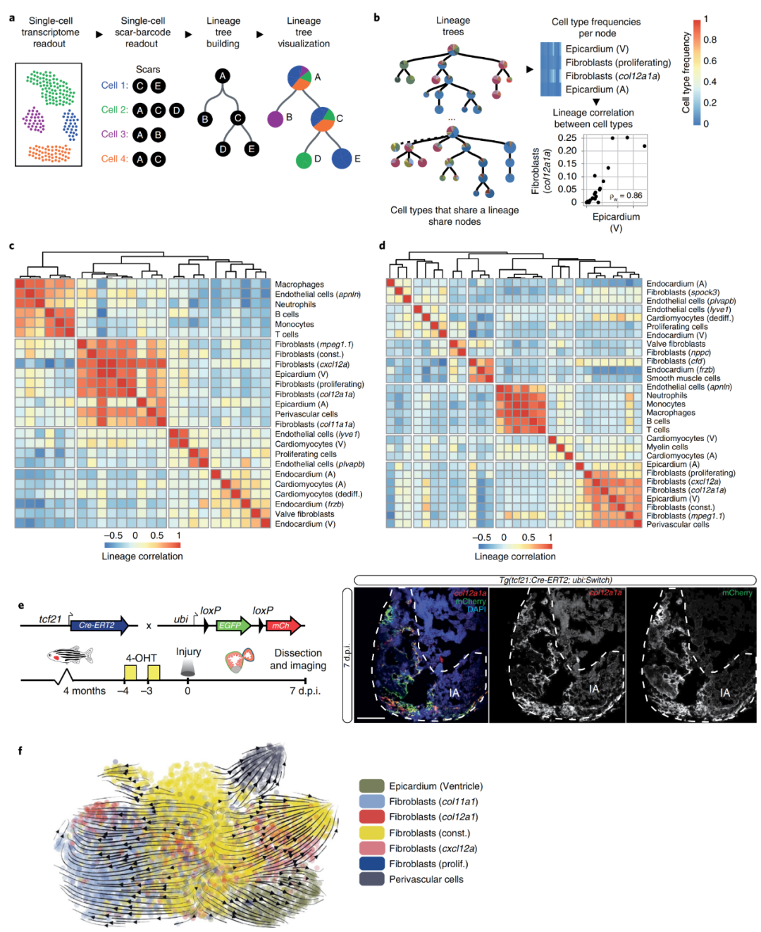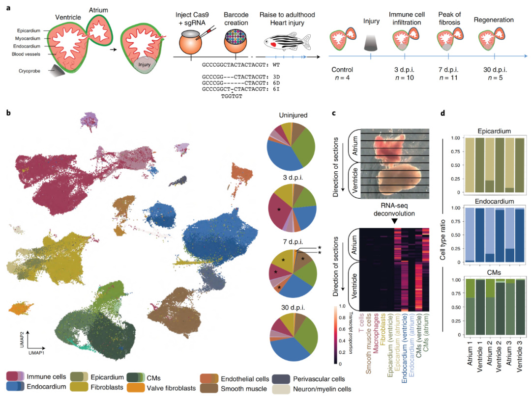 為了系統(tǒng)地識別健康和再生斑馬魚心臟中的細胞類型,作者對損傷前后不同階段的大約20萬個解離細胞進行了scRNA-seq(圖1a)。為了準(zhǔn)確得到細胞發(fā)育起源的相關(guān)信息,作者還應(yīng)用了一種基于CRISPR–Cas9技術(shù)的大規(guī)模平行譜系追蹤方法,通過注射Cas9和針對多拷貝轉(zhuǎn)基因(斑馬魚系中的dTomato:一種用于斑馬魚細胞追蹤和譜系分析的多光譜細胞標(biāo)記)的sgRNA,創(chuàng)建了作為譜系條形碼的“遺傳疤痕”來記錄早期發(fā)育中的譜系關(guān)系。