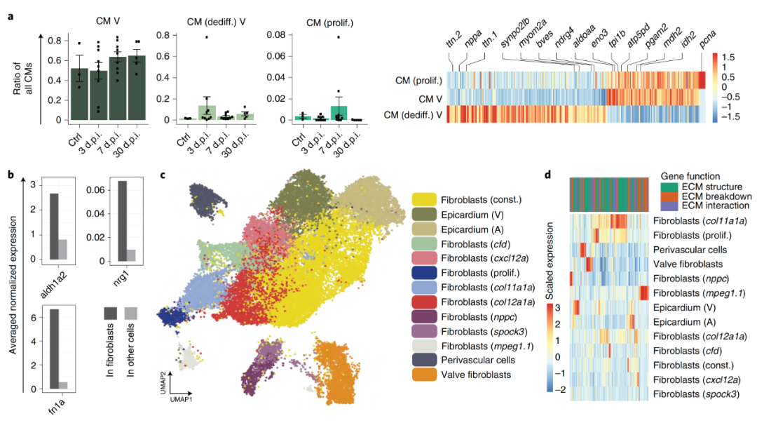 作者注意到心臟再生中三個成熟的信號因子在成纖維細胞中高度富集:合成視黃酸的酶aldh1a2、心肌細胞有絲分裂原nrg1和再生細胞外基質(zhì)(ECM)因子fn1a(圖2b)。為了更詳細地研究心臟成纖維細胞的多樣性,作者對成纖維細胞進行了亞群聚類。結(jié)果顯示出驚人的多樣性,有13個轉(zhuǎn)錄上不同的成纖維細胞聚類(圖2c)。這13個基因簇在ECM相關(guān)基因的表達譜上表現(xiàn)出明顯的差異(圖2d),但它們的轉(zhuǎn)錄組多樣性遠不止于此——去除ECM相關(guān)基因后,可以高精度鑒定相同的成纖維細胞亞型。