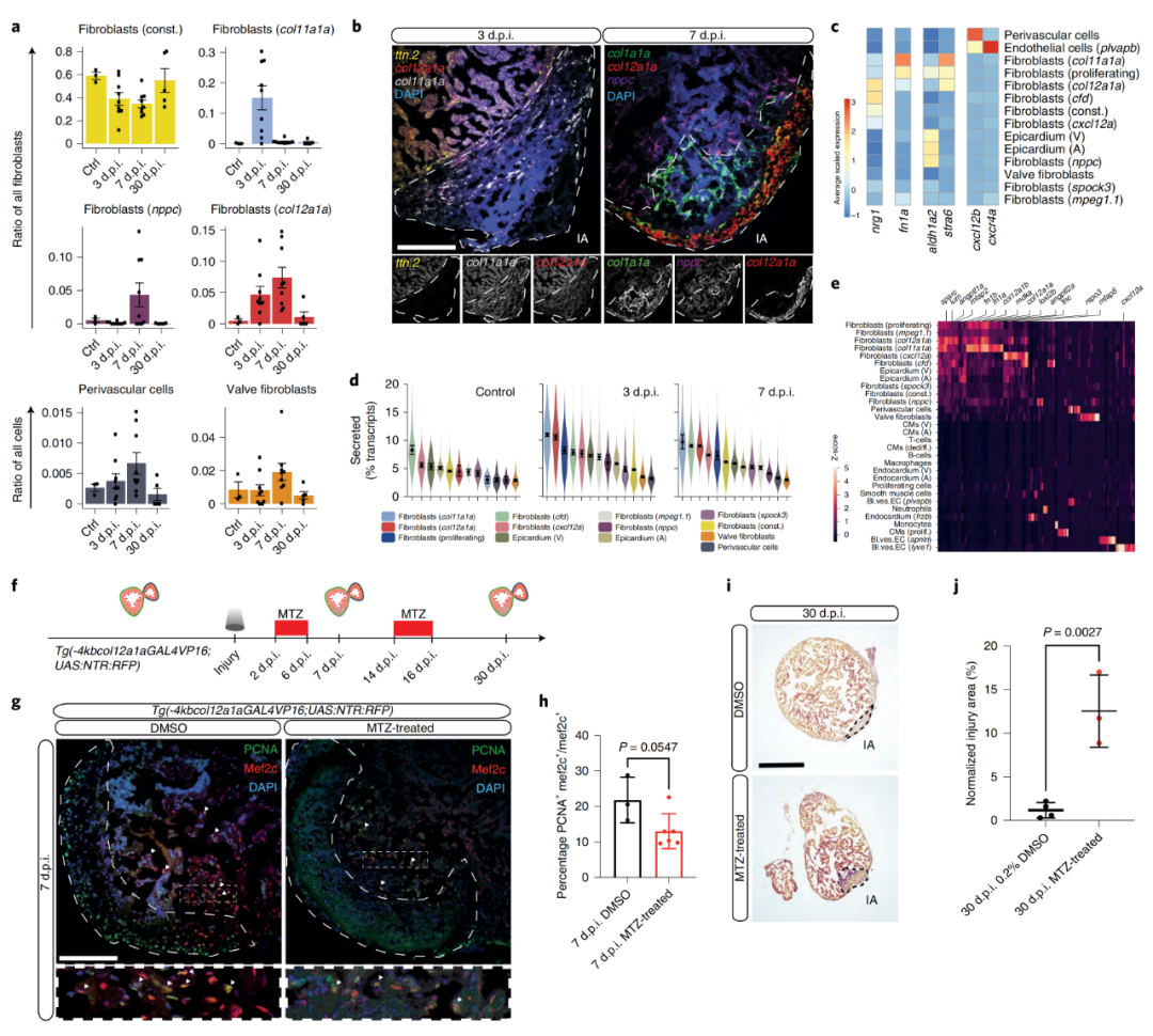 雖然作者對單細胞基因表達譜的時空分析強烈表明了瞬時成纖維細胞的再生功能,但還需要額外的實驗來驗證這一假設(shè)。為了從功能上評估瞬時col11a1a和col12a1a成纖維細胞的作用,作者使用硝基還原酶/甲硝唑(NTR/MTZ)系統(tǒng)進行靶向細胞剔除。在MTZ處理后的轉(zhuǎn)基因系Tg(-4kbcol12a1a:GAL4VP16;UAS:NTR:RFP)中,在7 d.p.i.時相較于對照,5 / 6的心臟顯示心肌細胞增殖減少,col12aa表達細胞減少(圖3g,h)。在30d.p.i.時,col12a1+細胞剔除顯著損害心臟再生(圖3i,j)??傊?,作者確定了心臟再生過程中具有潛在再生作用的三種成纖維細胞狀態(tài):col11a1a、col12a1a和nppc成纖維細胞?;蚣毎蕹龜?shù)據(jù)強烈表明col12a1a表達細胞在再生生態(tài)位中發(fā)揮了作用。