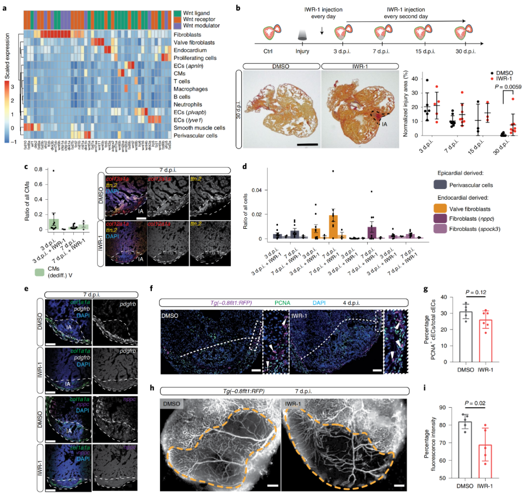 為了評估血管再生,作者對4d.p.i.下冠脈內(nèi)皮細胞(cECs)的增殖以及7 d.p.i.損傷區(qū)冠狀動脈的覆蓋范圍進行了定量分析。發(fā)現(xiàn)注射IWR-1后,cEC增殖在4 d.p.i.時有邊緣但不顯著的下降(圖6f,g)。然而,在7d.p.i.時,損傷區(qū)冠狀動脈覆蓋明顯減少(圖6h,j)。這些結(jié)果表明,Wnt抑制后觀察到的心臟再生減少至少部分是由血管再生缺陷介導(dǎo)的。這種缺陷似乎不是由cECs增殖減少引起的,而可能與血管再生的其他方面有關(guān)。