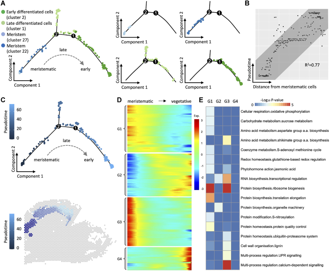 為了研究從分生組織細(xì)胞到營養(yǎng)型細(xì)胞(花被、唇瓣)和生殖細(xì)胞(花柱)的分化,研究團(tuán)隊(duì)用Monocle繪制了細(xì)胞狀態(tài)的軌跡。如圖2B所示,三簇分生組織細(xì)胞形成了一條連續(xù)的路徑,代表其發(fā)育過程,與其在組織學(xué)切片上的位置高度一致。該路徑分為兩條子路徑:一條是由花被片中的營養(yǎng)型細(xì)胞組成,另一條由花柱中的花藥原基生殖細(xì)胞組成。細(xì)胞類型變化的軌跡作為動(dòng)態(tài)發(fā)育過程的靜態(tài)投影,也可以理解為分生組織細(xì)胞的擬時(shí)序分化。如圖2C所示,此時(shí)營養(yǎng)型細(xì)胞出現(xiàn)較早,并分散在子路徑的遠(yuǎn)端。共鑒定出4,685個(gè)空間差異基因與發(fā)育擬時(shí)間相關(guān),對(duì)這些基因繪制分支軌跡基因表達(dá)熱圖,發(fā)現(xiàn)它們隨著發(fā)育路徑的分離表現(xiàn)出不同的表達(dá)模式(圖2D)。MapMan功能富集圖顯示它們主要富集在細(xì)胞壁代謝、激素、脂質(zhì)、蛋白質(zhì)和RNA合成等功能上(圖2E)。通過基因的擬時(shí)分布圖發(fā)現(xiàn)許多其他基因可能在分生組織、營養(yǎng)組織和生殖組織的細(xì)胞分化過程中發(fā)揮作用(圖2F)。