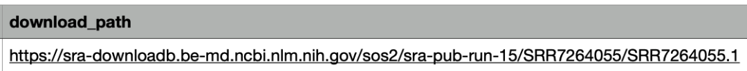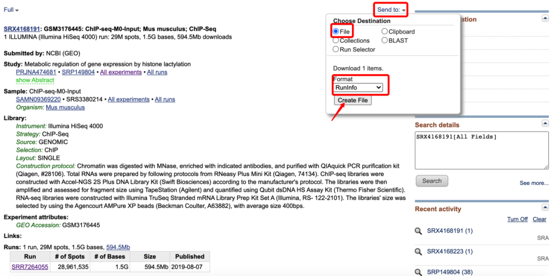 這里面包含了這個(gè)樣本的基本信息,包括測(cè)序平臺(tái)、文庫(kù)類(lèi)型、數(shù)據(jù)量等基本信息,然后點(diǎn)擊頁(yè)面右上方的Send to按鈕,選擇File,F(xiàn)ormat選擇RunInfo,然后點(diǎn)擊Creat file下載一個(gè)csv文件,打開(kāi)文件,可以看到一個(gè)下載鏈接