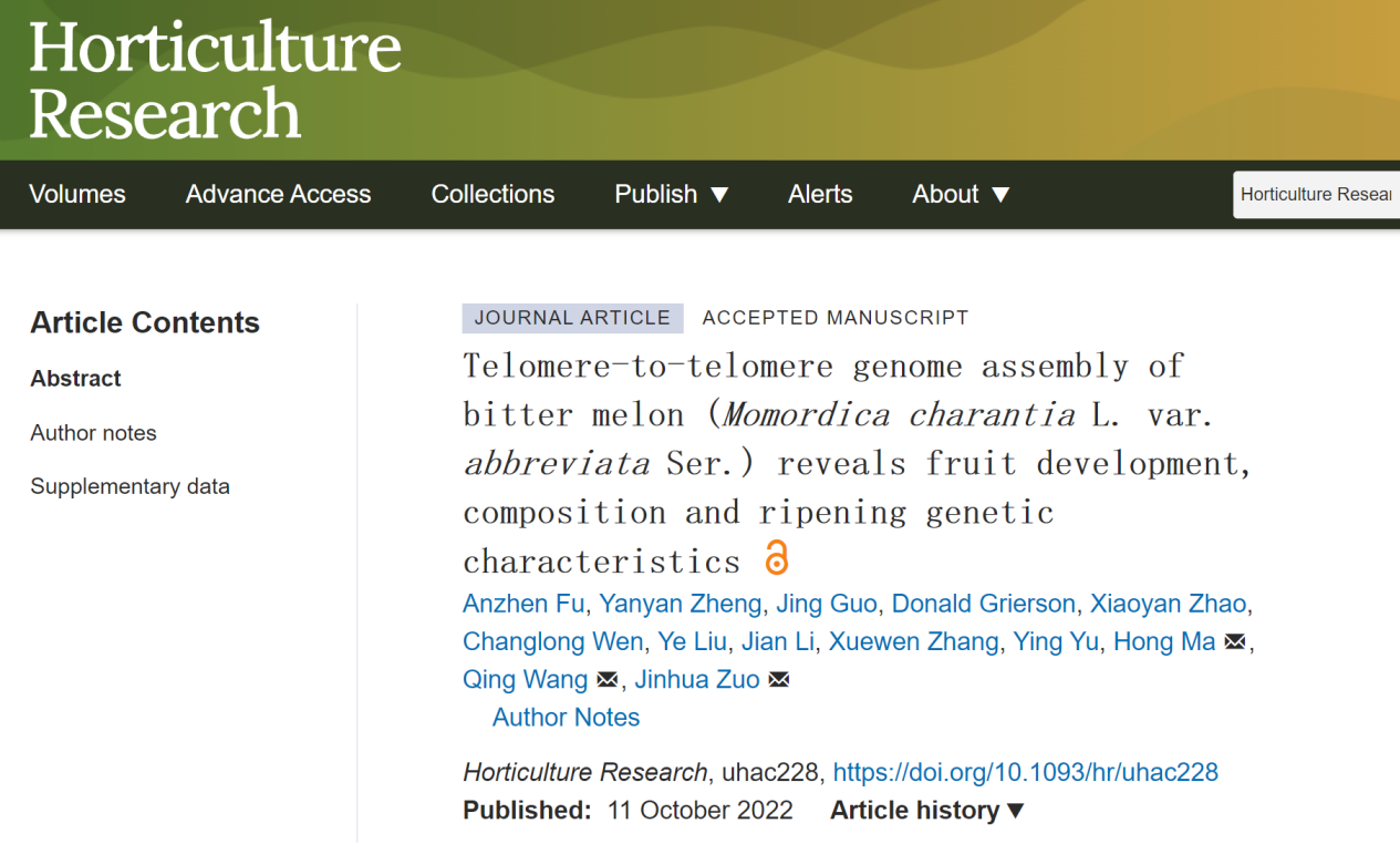 近日,北京市農(nóng)林科學院農(nóng)產(chǎn)品加工與食品營養(yǎng)研究所左進華研究員團隊聯(lián)合美國賓夕法尼亞州立大學馬紅教授團隊完成超高質(zhì)量苦瓜變種‘金鈴子’T2T基因組。主要研究成果“Telomere-to-telomere genome assembly of bitter melon (Momordica charantia L. var.?abbreviata Ser.) reveals fruit development, composition and ripening genetic characteristics”在線發(fā)表于園藝TOP期刊Horticulture Research。該研究揭示了‘金鈴子’基因組組成和進化關系以及果實生長發(fā)育的分子調(diào)控機制,進一步細化了苦瓜亞種材料差異表型的基因組變異特征,以及果實品質(zhì)的關鍵信息。本研究是該團隊在葫蘆科領域的完成的第3個高質(zhì)量基因組,為葫蘆科系統(tǒng)發(fā)育與應用研究起到了重要的推動作用。百邁客張學雯、余瑩作為共同作者,參與了本項研究。