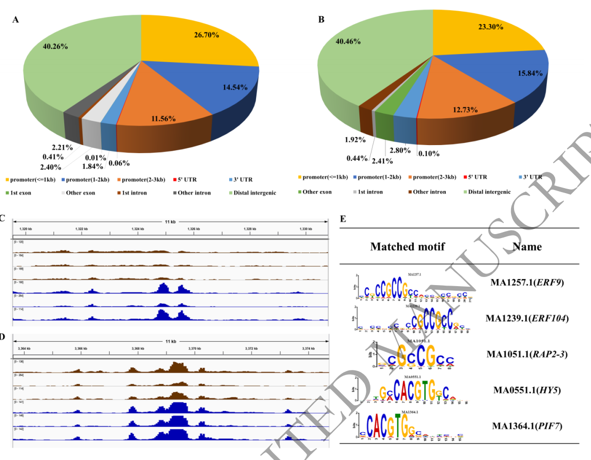 染色質(zhì)的開放區(qū)包含轉(zhuǎn)錄因子結合位點(TFBS),在轉(zhuǎn)錄因子(TFs)介導的基因表達調(diào)控中發(fā)揮重要作用。因此,作者通過對‘金鈴子’三個時期的果實材料進行ATAC-seq分析,以確定在生長過程中差異的染色質(zhì)開放區(qū)域。研究發(fā)現(xiàn),未成熟果實與破色期果實中,6號染色體上存在差異染色質(zhì)開放區(qū),主要是與類胡蘿卜素途徑和植物激素信號傳導相關的基因;破色期與成熟期果實相比,3號染色體上存在差異染色質(zhì)開放區(qū),主要的影響基因有乙烯應答轉(zhuǎn)錄因子WRI1、乙烯應答轉(zhuǎn)錄轉(zhuǎn)錄因子ERF118和生長素應答因子1(ARF1)等。