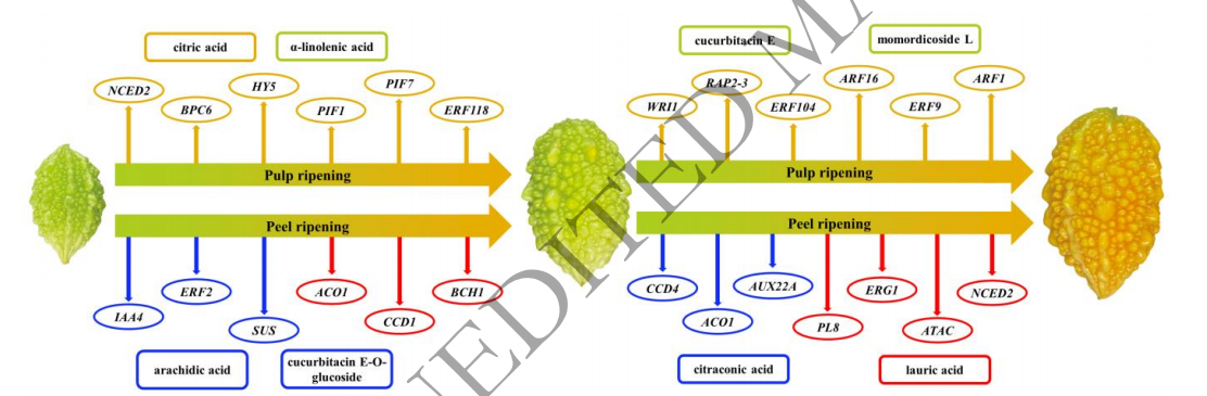?為了更全面地了解‘金鈴子’果實的發(fā)育成熟過程,作者對‘金鈴子’果實三個不同生長發(fā)育期的轉(zhuǎn)錄組和代謝組進行了系統(tǒng)分析。在果實生長發(fā)育前期,共鑒定出515個差異基因和216個差異代謝物,在果實生長發(fā)育后期,鑒定出4593個差異基因和376個差異代謝物,這些差異基因和差異代謝物參與調(diào)控‘金鈴子’果實生長發(fā)育過程中葫蘆素、皂苷、植物激素、氨基酸、脂類、類胡蘿卜素等的生物合成和代謝過程。這些差異決定了‘金鈴子’果實的品質(zhì)、營養(yǎng)價值以及果皮顏色的變化,為苦瓜基因組研究提供了一個新的遺傳資源。