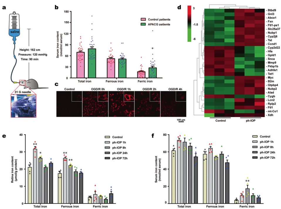 1. 通過分析急性原發(fā)性閉角型青光眼(APACG,Ph-IOP損傷最典型的一類青光眼)患者外周血清鐵離子含量發(fā)現(xiàn),青光眼患者血清中三價(jià)鐵離子含量較正常人群升高,推測鐵代謝可能參與調(diào)控了ph-IOP條件下RGC的損傷過程;