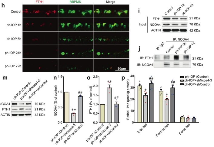 鐵蛋白(Ferritin)是一種廣泛存在的儲鐵蛋白,在 ph-IOP 損傷后1小時,F(xiàn)TH1(Ferritin亞基)的水平急劇下降(圖2h),這與 ph-IOP 損傷后早期的鐵積累一致;鐵自噬(ferritinophagy)是一種調(diào)節(jié)細(xì)胞內(nèi)鐵代謝的選擇性自噬,檢測視網(wǎng)膜內(nèi)源性NCOA4(鐵自噬關(guān)鍵調(diào)節(jié)蛋白)蛋白水平發(fā)現(xiàn),pH-IOP 損傷后NCOA4與 FTH1之間的內(nèi)源性相互作用增強(qiáng)(圖2i, j);敲降Ncoa4后增加了視網(wǎng)膜 FTH1水平(圖2m-o),并伴隨著 ph-IOP 損傷后視網(wǎng)膜中二價(jià)鐵離子水平的降低(圖2p)。