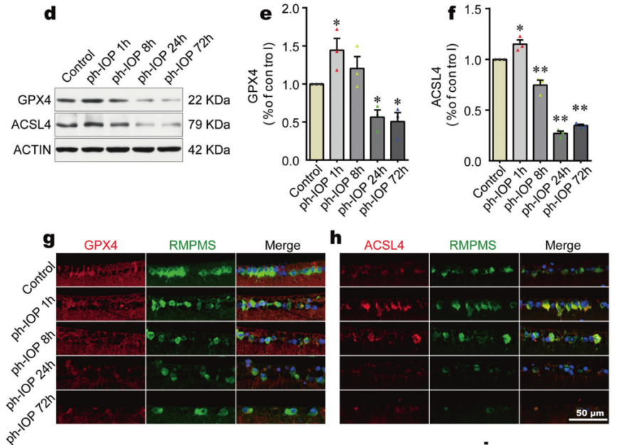 為了驗(yàn)證PH-IOP損失引起的視網(wǎng)膜鐵積累可能導(dǎo)致視網(wǎng)膜鐵死亡這一假設(shè),測量了氧化應(yīng)激相關(guān)生化指標(biāo),發(fā)現(xiàn)Ph-IOP損傷早期階段MDA含量顯著增加,而GSH和NADPH水平顯著降低;進(jìn)一步檢測鐵死亡核心標(biāo)志物GPX4(抑鐵死亡因子)和ACSL4(促鐵死亡因子)發(fā)現(xiàn),ph-IOP 損傷后24h,GPX4水平降低,在PH-IOP損傷后1h,ACSL4水平上調(diào)(圖3d-f);并且這些鐵死亡相關(guān)蛋白的變化主要集中在視網(wǎng)膜內(nèi)層,尤其是神經(jīng)節(jié)層(圖3g, h),提示鐵死亡誘導(dǎo)的細(xì)胞損傷可能集中在 RGC 中(位于視網(wǎng)膜最內(nèi)層);TEM檢測發(fā)現(xiàn)PH-IOP引起RGC線粒體收縮和線粒體膜密度增加,表明ph-IOP誘導(dǎo)的視網(wǎng)膜鐵累積導(dǎo)致視網(wǎng)膜鐵死亡,特別是在 RGC中。