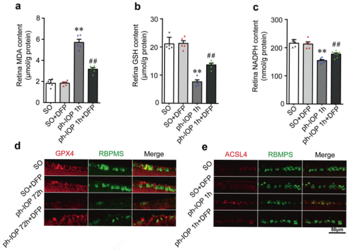 去鐵酮DPF作為鐵螯合劑目前已應(yīng)用于臨床治療鐵超負(fù)荷疾病,阻止患者血清鐵的蓄積。進(jìn)一步研究DFP對ph-IOP損傷小鼠鐵代謝的影響。體內(nèi)體外結(jié)果顯示,DFP處理可以顯著降低 ph-IOP誘導(dǎo)的視網(wǎng)膜二價(jià)鐵累積;DFP治療可降低ph-IOP損傷后視網(wǎng)膜MDA含量(圖4a),增加GSH和NADPH水平(圖5b, c );此外,在ph-IOP損傷小鼠中,DFP處理恢復(fù)了GPX4水平,并降低了ACSL4水平(圖5d-e)。以上結(jié)果表明,DFP可以改善ph-IOP誘導(dǎo)的視網(wǎng)膜鐵死亡。